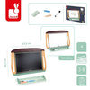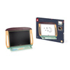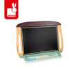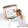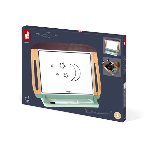 Drewniana dwustronna tablica francuskiej marki JANOD to doskonały prezent dla małego ucznia i artysty. Po czarnej stronie można pisać i rysować kredą, a po białej - specjalnym mazakiem (tablica suchościeralna). Tablica posiada wygodną podstawkę – półeczkę na akcesoria, które znajdują się w zestawie: 2 kredy, ścieralny marker oraz gąbka. Tablica ma lekko obły kształt w stylu retro i oryginalną, stylową kolorystykę – utrzymana jest w naturalnym odcieniu drewna z elementami burgundowego brązu i pastelowej turkusowej zieleni. Rozwija wyobraźnię, zdolności manualne i artystyczne dziecka. Pomaga w nauce pisania i liczenia, jest doskonałym narzędziem do nauki i ozdobą pokoju dziecka.