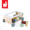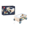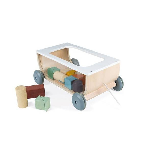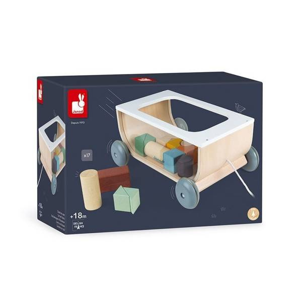 Drewniany wózek z 17 klockami do ciągnięcia z serii Sweet Cocoon francuskiej marki JANOD to świetny towarzysz pierwszych kroków dziecka. Wykonany jest z giętego drewna, ma bezpieczne, zaokrąglone brzegi i przezroczyste boki, tworzące łatwo dostępne miejsce na klocki. Zabawka zachwyca estetyką wykonania i pięknymi, jakby „dorosłymi” kolorami jasnego drewna, szarości i bieli. Wózek jest lekki, wygodny do prowadzenia na sznureczku. Szeroko rozstawione kółka zapewniają mu stabilność, a dzięki gumowym wykończeniom, nie rysują podłogi w domu. W komplecie jest 17 sztuk drewnianych klocków w pięknych odcieniach, m.in. niebieskiego, zielonego, brązu, pomarańczu czy naturalnego drewna. Klocki mają różne kształty, co umożliwia tworzenie z nich wielu niepowtarzalnych konstrukcji. Wózek może służyć też do przechowywania i przewożenia ukochanych zabawek.
