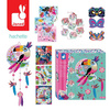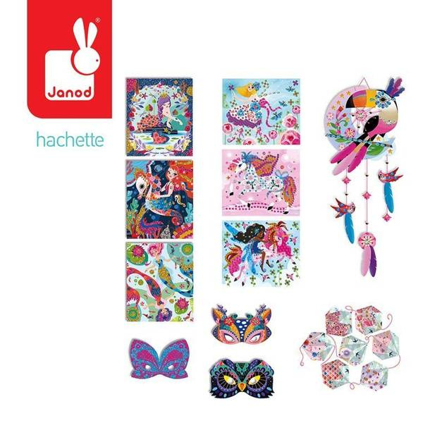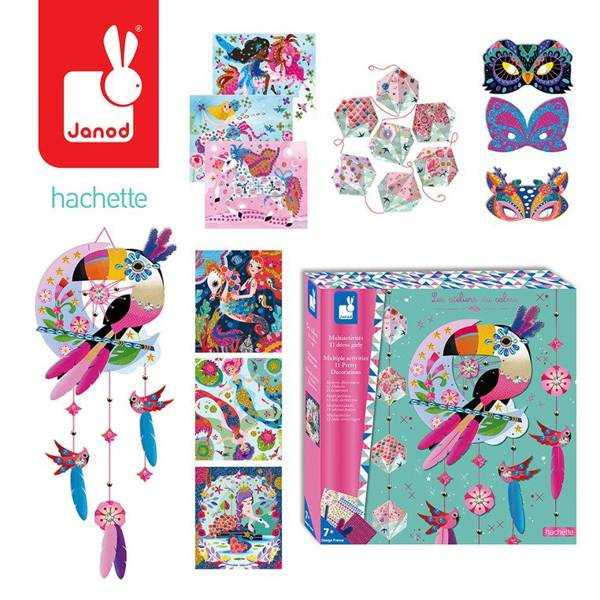 Multi - zestaw kreatywny dekoracje Tukan francuskiej marki JANOD zawiera różnorodne, kolorowe elementy, z których można utworzyć aż 11 przepięknych ozdób do dziecięcego pokoju! W zestawie do wykonania są: łapacz snów z tukanem, girlanda z origami, 3 zwierzęce maski do zdrapywania, 3 mozaiki z pianek i cyrkonii z jednorożcami oraz 3 brokatowe ilustracje z syrenami. W jego skład wchodzą: 25 wzorzystych papierów do origami wraz z instrukcjami składania brył, 2 sznurki, 2 metalowe dzwoneczki, 10 barwnych piór, 5 arkuszy z piankowymi naklejkami, 1 arkusz samoprzylepnych cyrkonii w różnych kształtach i kolorach, 3 tubki brokatu i 2 drewniane szpatułki – do zdrapywania wierzchniej warstwy na maskach, odkrywania powierzchni, przeznaczonych do ozdabiania czy równomiernego rozprowadzania brokatu. Składanie origami, naklejanie drobnych elementów, ozdabianie brokatem, zdrapywanie itp. to dla dziecka długie godziny angażującej i jednocześnie uspokajającej zabawy. Gotowe bajeczne dzieła mogą stać się powodem do dumy i wspaniałymi dekoracjami dziecięcego pokoju.