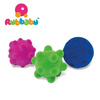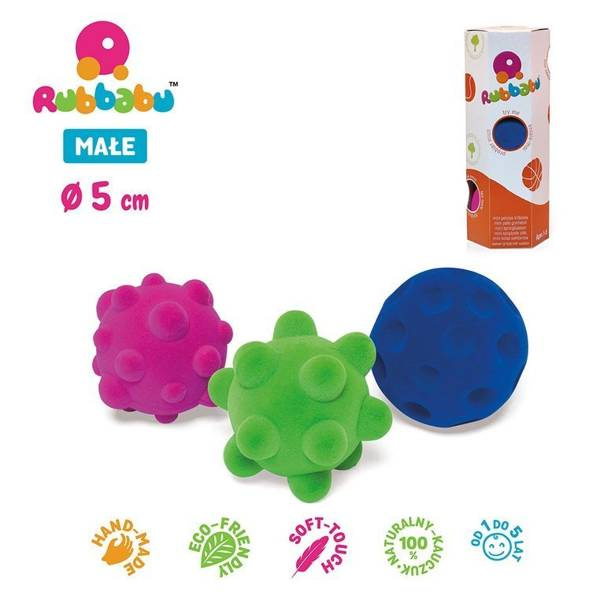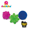 Zestaw 3 małych sensorycznych piłek marki Rubbabu, rekomendowanych dla dzieci od 1. roku życia.