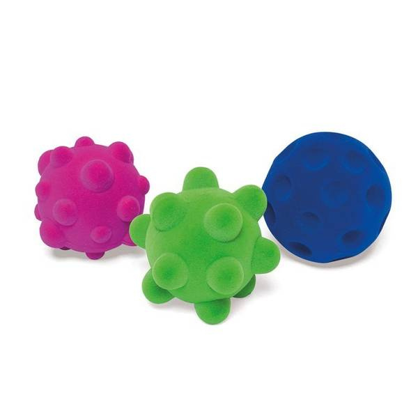 Piłki są wyjątkowo miękkie i przyjemne w dotyku, mają jaskrawe kolory, a ich zróżnicowane faktury, wzory i wypustki zachęcają dziecko do zabawy, przy okazji stymulując zmysł dotyku. Kule są lekkie i mają niewielkie rozmiary (5 cm średnicy), stąd idealnie pasują do małych rączek. Aktywizują maluchy do chwytania. Można je toczyć, odbijać, ściskać, ugniatać, rzucać… Są w pełni bezpieczne, także dla niemowląt. Ich oryginalnie wyprofilowane kształty sprawiają, że bawienie się nimi wspiera rozwój małej motoryki. Starsze dzieci mogą ich śmiało używać do różnego rodzaju gier.