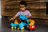 Wszystkie zabawki są wyjątkowo miękkie i przyjemne w dotyku, mają jaskrawe kolory i żółte kółka. Dzięki prostej formie i stymulującej teksturze, świetnie rozwijają dziecięcą wyobraźnię. Pojazdy są lekkie, a ich rozmiary (ok. 14 cm długości) idealnie pasują do małych rączek, zachęcając maluchy do chwytania i poruszania. Są w pełni bezpieczne, także dla niemowląt. Oryginalnie wyprofilowane kształty sprawiają, że zabawa nimi wspiera rozwój małej motoryki. Dla starszych dzieci sterowanie pojazdami to z kolei lekcja koordynacji ręka-oko. Można je bezpiecznie rzucać i ściskać.