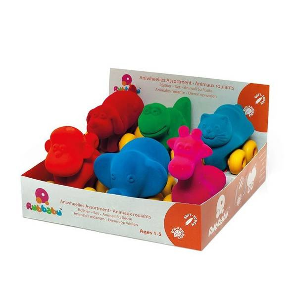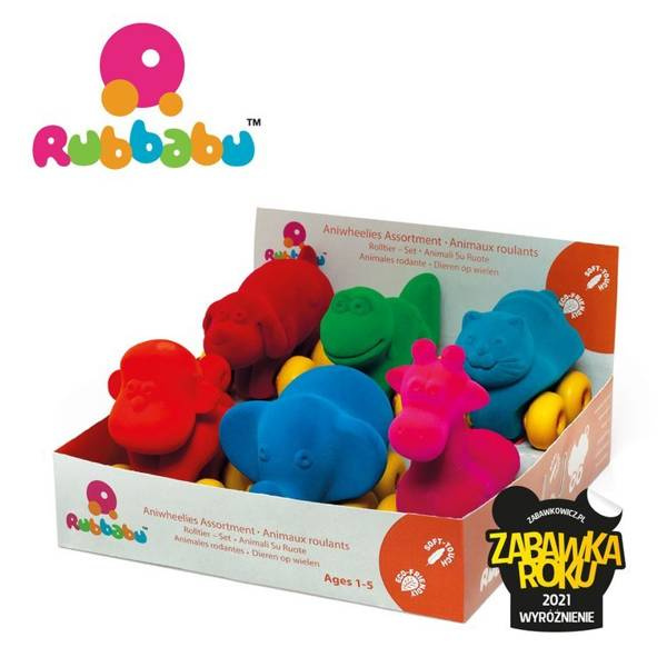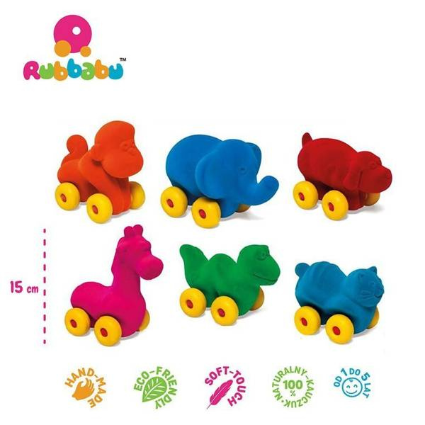 6 sensorycznych zwierzątek - pojazdów w średnim rozmiarze (14 cm) marki Rubbabu to zestaw różnorodnych, rozwojowych zabawek w kształcie zwierzątek na kółkach, rekomendowanych dla dzieci od 1. roku życia.