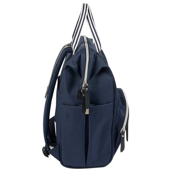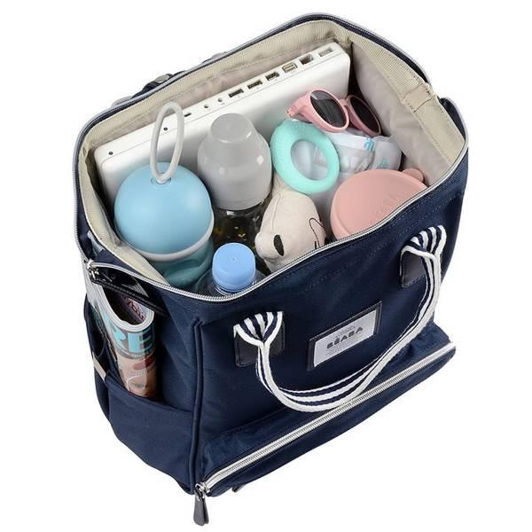 Niezwykle pomysłowy, kompaktowy, prosty w formie plecak dla aktywnych rodziców francuskiej marki BEABA. Nie zajmuje rąk, co ułatwia spacery czy wycieczki z maluchem, jest szeroki i wygodny, a dzięki kieszeniom, praktycznym schowkom i akcesoriom, dołączonym do zestawu, można pomieścić w nim bez trudu niezbędne rzeczy dziecka i opiekuna oraz wygodnie je posegregować. Modny design, inspirowany stylem marynarskim i kolorystyka: piękny, głęboki odcień granatu ze srebrnymi suwakami, rączkami w biało-granatowe paski i czarnymi wykończeniami z ekoskóry, czynią go uniwersalnym, zarówno dla kobiet, jak i mężczyzn. Wykonany jest z wysokiej jakości, wodoodpornych i łatwych do czyszczenia tkanin.