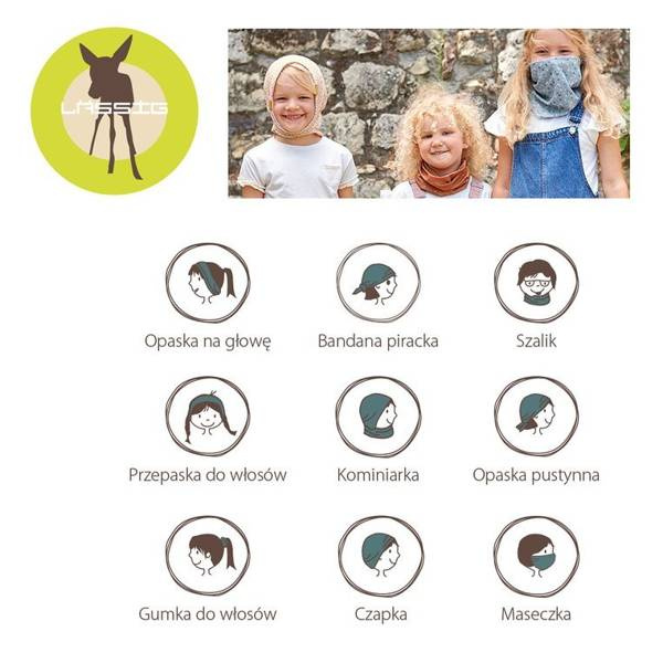 Praktyczna wielofunkcyjna chusta komin Flexi Loop niemieckiej marki LASSIG to bardzo przydatne akcesorium dla dzieci od 2 do ok. 9 lat (obwód głowy ok. 50-55 cm). Ma wszechstronne zastosowanie: może służyć jako szalik, chusta, czapka, piratka lub opaska na głowę, jako maseczka na usta i nos dziecka w miejscach publicznych, autobusie czy sklepie, a także jako kominiarka podczas uprawiania sportu, np. pod kask rowerowy lub narciarski.