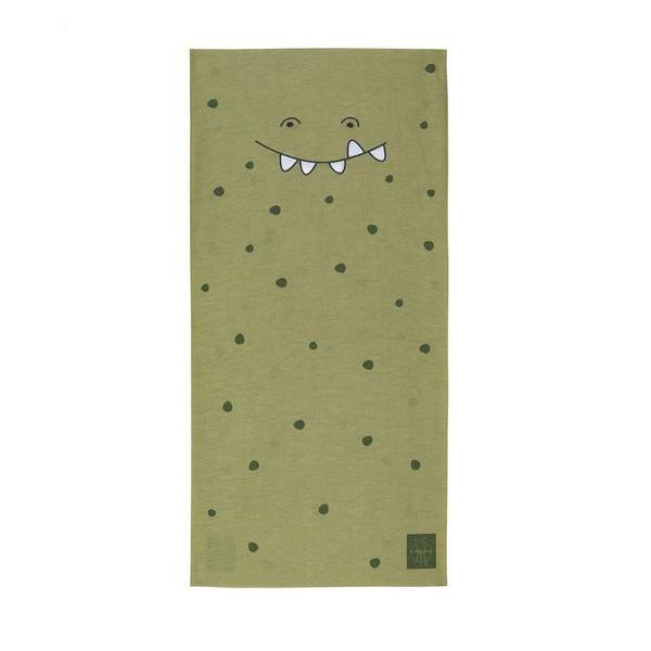 Motyw: uzębiony pysk krokodyla i ciemno zielone kropki na oliwkowym tle