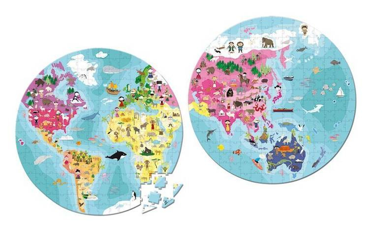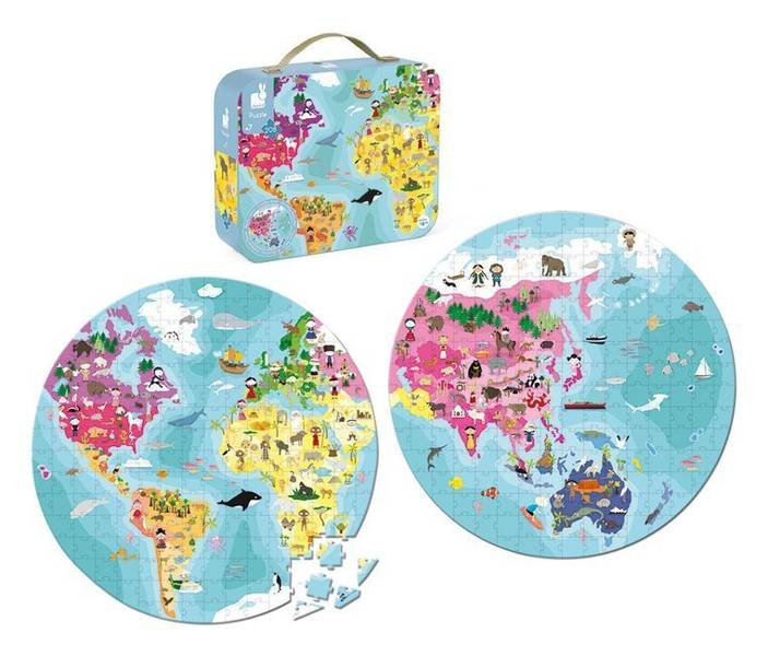 Zestaw dwustronnych puzzli w walizce Błękitna planeta francuskiej marki JANOD składa się z 208 elementów, po ułożeniu tworzących okrągłą mapę świata z fauną, florą i innymi motywami, charakterystycznymi dla poszczególnych kontynentów. Po jednej stronie obrazka znajduje się Afryka, Ameryki i Europa, po drugiej – Azja, Australia i Oceania. Puzzle wykonane są z solidnego kartonu i zaprojektowane we Francji. Zapakowane w estetyczną walizeczkę z rączką. Idealnie nadają się na prezent.