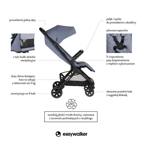 Holenderska marka Easywalker istnieje na rynku od 1989 roku. Słynie z prostego stylu, połączonego z rewolucyjnymi i funkcjonalnymi rozwiązaniami, które zdobywają wiele nagród. Easywalker tworzy z myślą o rodzinach, które uwielbiają wspólne, aktywne spędzanie czasu. Wózki i akcesoria Easywalker mają przede wszystkim ułatwiać rodzicom codzienność z dzieckiem, pozwalać na celebrowanie wspólnego czasu w spokoju i bez przeszkód, niezależnie od tego, czy podróżują czy spacerują, wędrują przed siebie czy kluczą uliczkami w pobliżu domu. Wyróżnia je wysoka jakość, dbałość o szczegóły i wyjątkowy design. Łączą wygodę dziecka z potrzebami rodzica.
