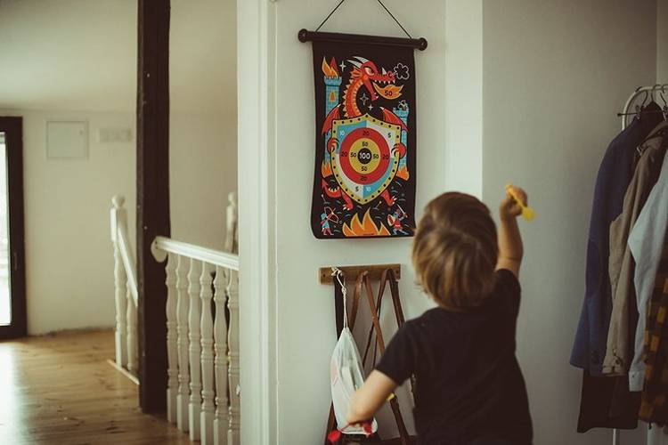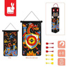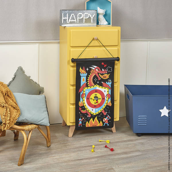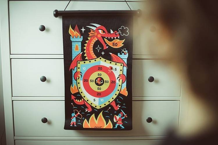Magnetyczna gra w rzutki Smoki francuskiej marki JANOD to wspaniała zabawa dla dwojga – zarówno dzieci, jak i ich rodziców. Zestaw składa się ze zwijanej na rolkę tarczy ze sznurkiem do jej zawieszenia, np. na ścianie, oraz z 6 magnetycznych rzutek w dwóch kolorach (3 czerwone i 3 żółte). Czarna tkanina tarczy ilustrowana jest dwustronnie kolorowymi motywami ziejących ogniem smoków i atakowanych przez nie rycerzy i zamków. Rzutkami należy celować w tarczę z odpowiedniej, ustalonej przez graczy odległości, w taki sposób, by trafić w oznaczone na niej punktowane miejsca. Celem gry jest zgromadzenie w trzech rzutach jak największej ilości punktów. Gracz, któremu się to uda, wygrywa. Gra ta ćwiczy koncentrację i zręczność.