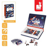 Magnetibook Kosmos z bestsellerowej linii Magnetibook zawiera 52 magnesy (utrzymane w czerwono – biało - niebieskiej kolorystyce), które stanowią części składowe do stworzenia pojazdów kosmicznych, astronautów, rakiet, satelit i innych elementów pozaziemskiej przestrzeni oraz 18 kart z ilustracjami, na których można się wzorować przy tworzeniu własnych kosmicznych historii. Magnesy pozwalają również na układanie wymyślonych przez siebie konstrukcji. To świetna rozrywka dla małych miłośników kosmosu, a także wszystkich twórczych dzieci.