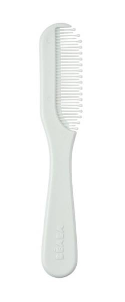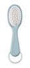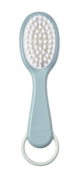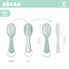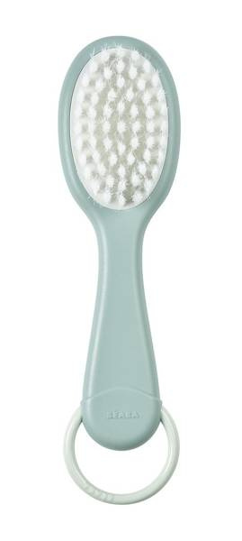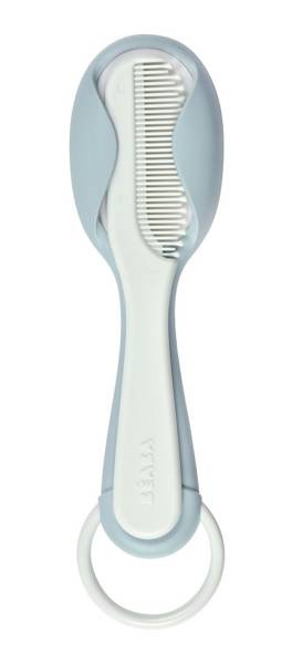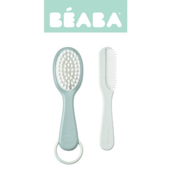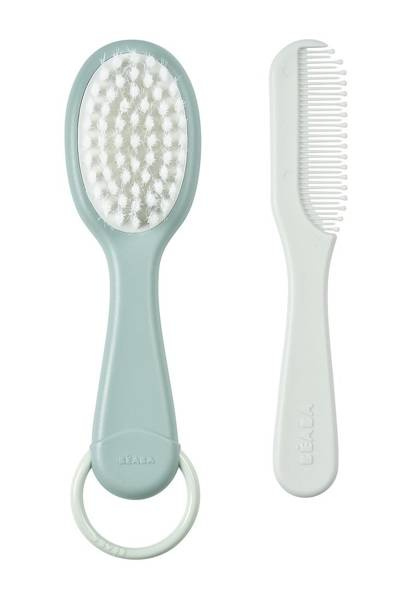 Komplet do pielęgnacji włosów niemowlęcia francuskiej marki BEABA składa się ze szczoteczki z bardzo miękkim nylonowym włosiem oraz grzebienia z zaokrąglonymi ząbkami. Są one delikatne dla niemowlęcej główki, a ponadto mają ergonomiczne kształty, w tym szerokie zaokrąglone rączki, zapewniające stabilny chwyt i właściwe przyleganie do dłoni. Grzebień można przechowywać łącznie ze szczotką, co oszczędza miejsce i pomaga w utrzymaniu porządku. Szczotka posiada ponadto praktyczny uchwyt do zawieszania lub zamocowania w kosmetyczce maluszka.