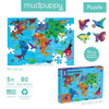 Puzzle edukacyjne Świat dinozaurów amerykańskiej marki MUDPUPPY to 80-cio elementowa układanka, w której 15 klocków ma kształt dinozaurów, umiejscowionych w rejonach, w których występowały. Ułożenie całej mapy pomaga dziecku poznać wszystkie kontynenty i przyporządkować do nich odpowiednie gatunki prehistorycznych stworzeń (niektóre są już naniesione na mapę). Do zestawu dołączony jest plakat z przedstawicielami i nazwami 33 gatunków dinozaurów. Wyjątkowy design i przyjazne barwy dodatkowo zachęcają dziecko do zabawy. Puzzle zapakowane są w estetyczne pudełko. Idealnie nadają się na prezent.
