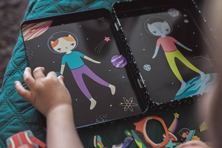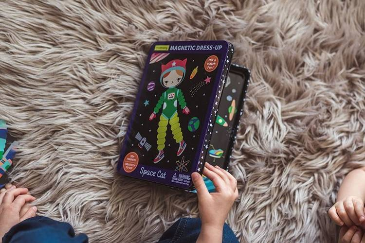 Zestaw magnesów do tworzenia postaci Kosmiczny kot amerykańskiej marki MUDPUPPY to wyjątkowo kreatywna zabawka dla dzieci od 4 roku życia. Na 2 tłach na wewnętrznych stronach metalowego pudełka przedstawiona jest przestrzeń kosmiczna i dwie oryginalne postacie kotów - astronautów. Można na nich umieszczać wybrane magnesy - stroje, tj. kaski, kombinezony, buty z napędem rakietowym oraz inne dodatki, np. satelity czy ciała niebieskie (ponad 50 elementów), tworząc przy tym wiele ciekawych opowieści. Zabawka ma poręczny format, sprawdza się w domu i w podróży.