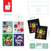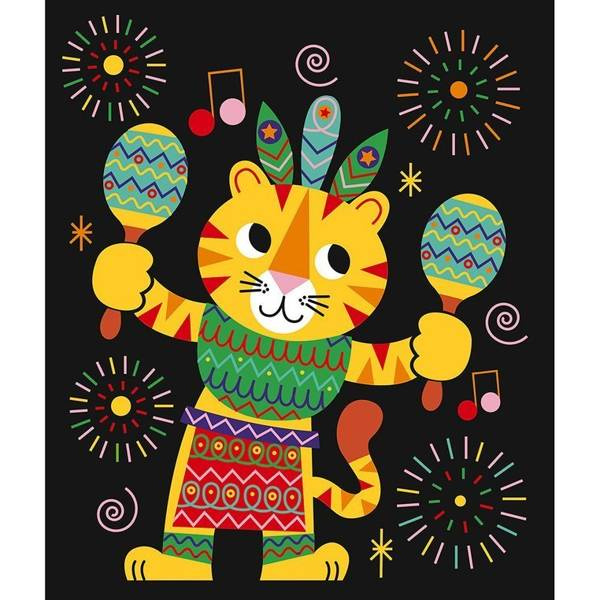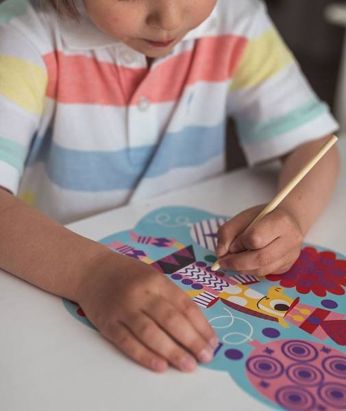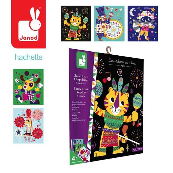 Zestaw kreatywny Do zdrapywania Graficzne zwierzątka francuskiej marki JANOD zawiera 5 plansz-obrazków z solidnego kartonu, przedstawiających zabawne i bajecznie kolorowe stworzenia w cyrkowych strojach: żyrafę, niedźwiadka, tygrysa, pieska i szopa. Obrazki są pokryte wierzchnią warstwą, którą można zdrapywać za pomocą dołączonego do zestawu patyczka, według wzoru lub własnych pomysłów. Zdrapywanie to dla dziecka długie godziny angażującej i jednocześnie uspokajającej, wyciszającej zabawy, a gotowe dzieła mogą stać się wspaniałą dekoracją dziecięcego pokoju.