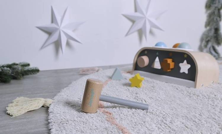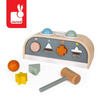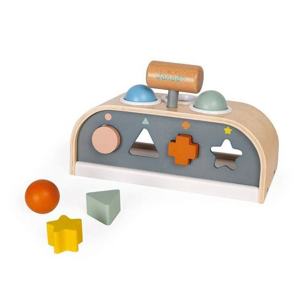 Drewniana przebijanka i sorter kształtów 3 w 1 z serii Sweet Cocoon francuskiej marki JANOD rozwija u dziecka wiele kluczowych umiejętności, m.in. rozróżnianie i dopasowywanie kształtów i kolorów oraz tzw. małą motorykę, a ponadto uczy koncentracji, spostrzegawczości i cierpliwości. Zabawka wykonana jest z giętego drewna, ma bezpieczne, zaokrąglone brzegi i jeden otwarty bok, dzięki czemu dostęp do klocków jest łatwy. W jej górnej części znajdują się trzy otwory na drewniane kule, które można uderzać, dołączonym do zabawki, poręcznym drewnianym młotkiem. Przednia ścianka posiada cztery otwory w geometrycznych kształtach – koło, trójkąt, krzyżyk i gwiazda – przez które można przekładać odpowiednie klocki, a od spodu znajdują się cztery wgłębienia w kolorach i kształtach, odpowiadających kolorom i kształtom klocków. Zabawka zachwyca estetyką wykonania i pięknymi, jakby „dorosłymi” kolorami jasnego drewna, szarości i bieli oraz odcieniach niebieskiego, żółtego, różu i pomarańczu na klockach.