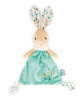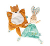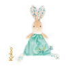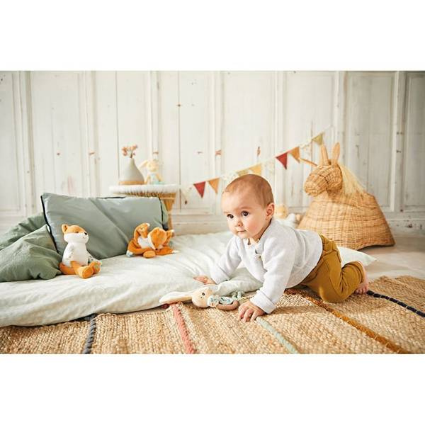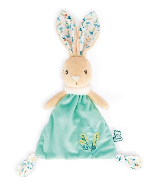 Uroczy komforter Zajączek Justin francuskiej marki KALOO to idealna zabawka dla Twojego dziecka, bezpieczna już od pierwszych dni życia. Jest niezwykle miękka, piękna i perfekcyjnie wykończona. Ma kształt jasnoniebieskiej puchatej trójkątnej chusteczki z białym futerkowym kołnierzykiem oraz słodkim zajęczym pyszczkiem z długimi uszami w kolorze beżowym. Górne łapki mają kształt mięciutkich wałeczków, a dolne są zawiązane na supełki. Komforter służy do tulenia, gryzienia supełków i uszek, jak i uspokajania maluszka. Pomaga przy ząbkowaniu. Rozmiarami dopasowany jest do małych rączek, wspiera naukę chwytania. Ma haftowane oczy i buzię oraz leśne kwiatki w dole brzuszka.