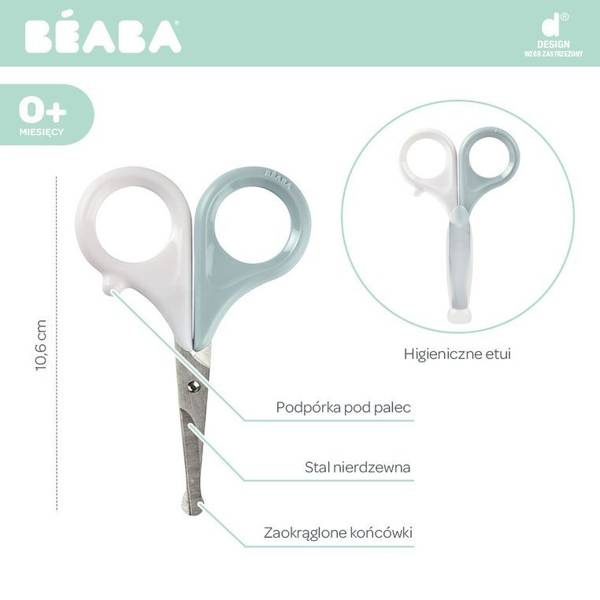 Ergonomiczne nożyczki do dziecięcych paznokci francuskiej marki BEABA. Delikatne i poręczne. Profilowane uchwyty i podpórka na palec zapewniają łatwość użytkowania, stabilność chwytu i precyzję ruchów. Zaokrąglone końcówki minimalizują ryzyko skaleczenia. Nożyczki są wykonane ze stali nierdzewnej, można je dezynfekować w alkoholu. W komplecie znajduje się wygodne etui, zapewniające higienę i wygodę użytkowania.