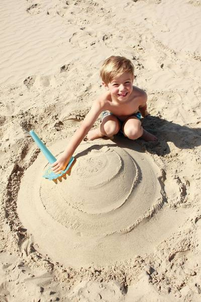 Łopatka wielofunkcyjna Triplet belgijskiej marki Quut przyciąga wzrok niebanalnym designem i oryginalną kolorystyką. Jest poręczna, lekka i łatwa do utrzymania przez dziecko. To prawdziwie wszechstronne narzędzie 4 w 1: może być łopatką, grabkami, sitkiem i lejkiem do wody. Można także przenosić na niej np. muszelki lub wykorzystywać w każdy, dowolny sposób, jaki podpowie dziecku wyobraźnia. Gwarantuje inteligentną aktywność na świeżym powietrzu, i to przez cały rok. Sprawdza się bowiem nie tylko do zabaw w piasku, ale także w wodzie (nawet w wannie), śniegu czy ogrodzie.
