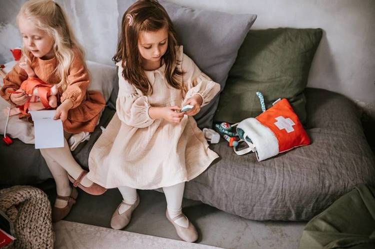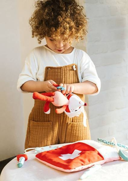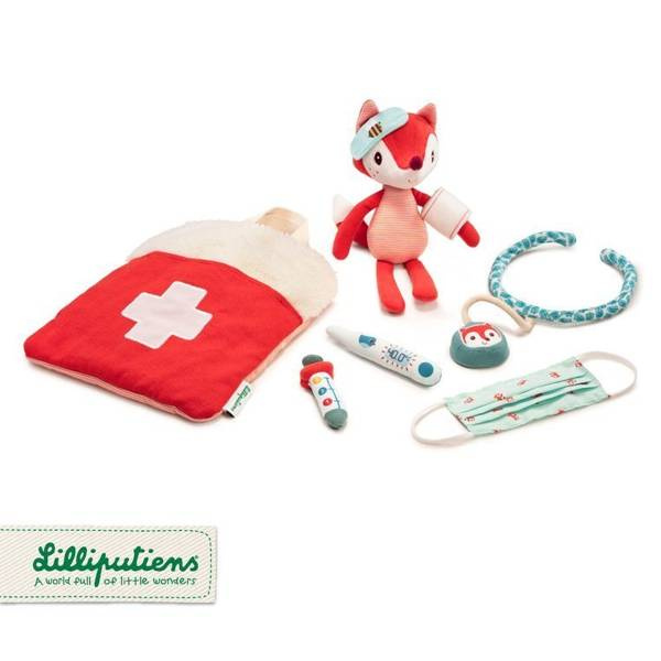 Torebka lekarska z akcesoriami z kolekcji Lisiczka Alice belgijskiej marki Lilliputiens to doskonała zabawka dla każdego dziecka, które lubi naśladować dorosłych. Płaska torba - etui z uchwytem wykonana została z miękkiego materiału, ma czerwono-biały kolor i lekarski krzyż na froncie. Może także pełnić rolę szpitalnego łóżka. W zestawie znajduje się pacjentka – Lisiczka Alice oraz akcesoria, potrzebne do jej zbadania i wyleczenia: materiałowy stetoskop, termometr, strzykawka, bandaż i plaster, który można przyczepiać na rzep oraz maseczka dla dziecka - lekarza. Wszystkie elementy zostały perfekcyjnie wykończone, z dbałością o każdy szczegół i są w pełni bezpieczne dla dziecka. Komplet jest idealny do zabawy w szpital czy wizytę u lekarza. Jest także świetnym sposobem na oswojenie dziecka z takimi sytuacjami.