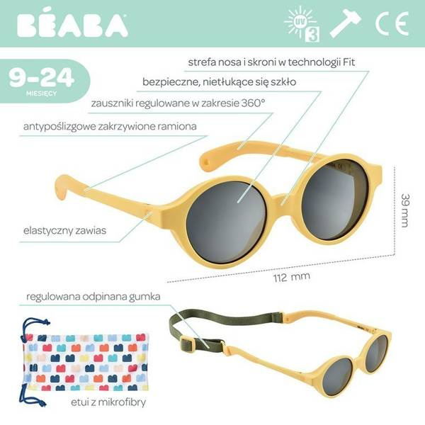 Okulary przeciwsłoneczne francuskiej marki BEABA przeznaczone są dla dzieci powyżej 9. miesiąca życia. Zaprojektowane z naciskiem na praktyczność, bezpieczeństwo i wygodę użytkowania, a przede wszystkim ochronę oczu malucha. Antypoślizgowe, zakrzywione ramiona nie uciskają głowy dziecka, są dobrze dopasowane i pozostają na miejscu, również podczas typowych dziecięcych aktywności. Strefa nosa i skroni wykonana została w technologii Fit z elastycznego, trwałego tworzywa, które dopasowuje się do kształtu twarzy. Szczególny, obły kształt oprawek zabezpiecza oczy malucha przed promieniami słonecznymi wpadającymi również z boku. Specjalne, nietłukące się „szkiełka” to ciemne soczewki kategorii 3, tj. gwarantujące maksymalną, 100% ochronę przed promieniami UV. Nadają się do ekspozycji na słońce również na plaży czy w górach. Okulary posiadają regulowane zauszniki 360° oraz elastyczną opaskę, którą można w razie potrzeby zamocować na klik (dzięki silikonowym zaczepom) dla optymalnego komfortu.
