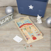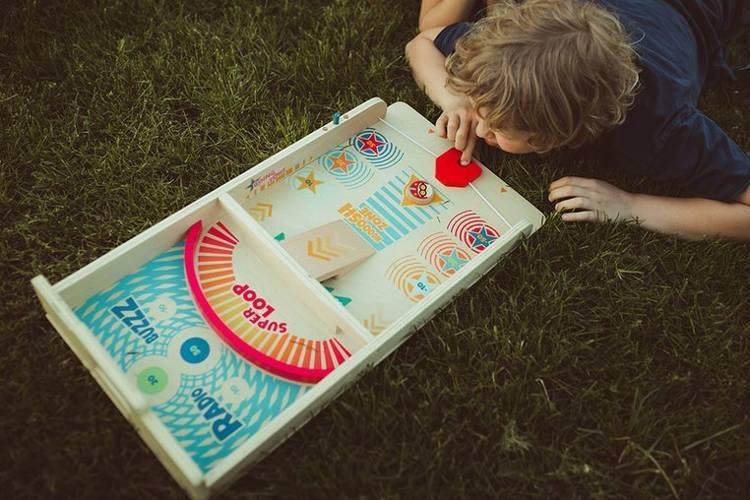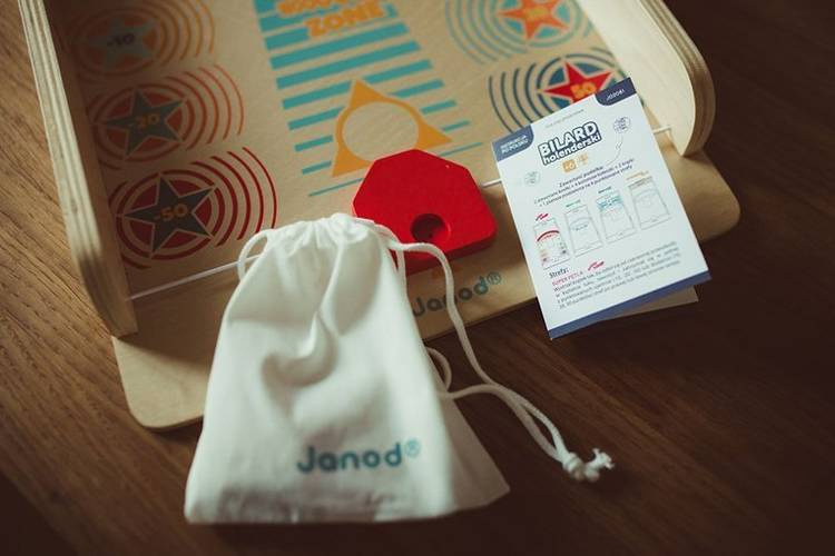 Gra zręcznościowa Bilard holenderski francuskiej marki JANOD to wspaniała zabawa, zarówno dla dwójki dzieci, jak i dziecka oraz rodzica. W skład zestawu wchodzi drewniana plansza z nieco wyższymi bocznymi brzegami, rampą, wieloma punktowanymi polami, trzema okienkami, przez które mogą przelatywać krążki graczy i ściankami-przeszkodami, od których mogą się odbijać oraz gumką z klockiem do wystrzeliwania tych krążków. W komplecie są ponadto: 2 drewniane krążki-zawodnicy, 2 kostki z punktami oraz 4 kołeczki, które kolorami odpowiadają punktowanym polom na planszy (niebieski, żółty, czerwony i zielony). Celem gry jest strzelanie swoim zawodnikiem tak, by trafiał on na jak najwyżej punktowane pole. Gracz, któremu uda się zdobyć najwięcej punktów – wygrywa. Gra ta ćwiczy koordynację ruchową, wspiera relację ręka-oko, uczy cierpliwości i skupienia.