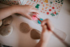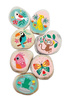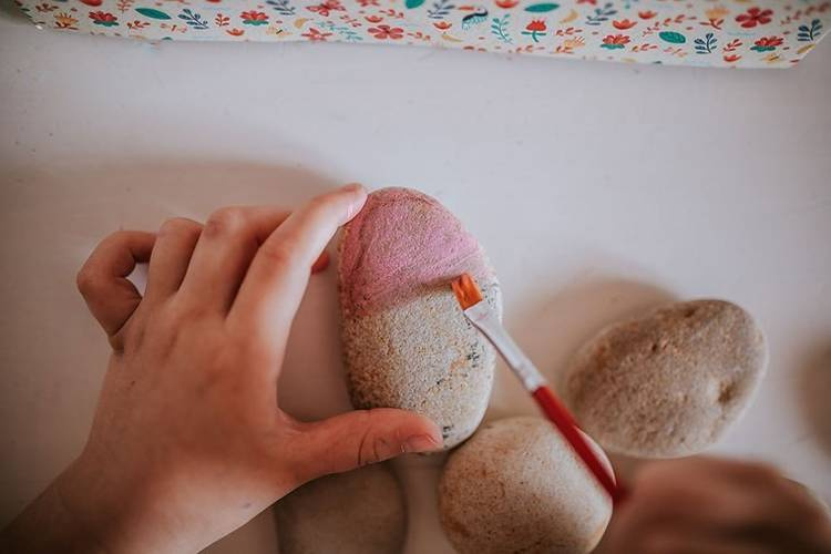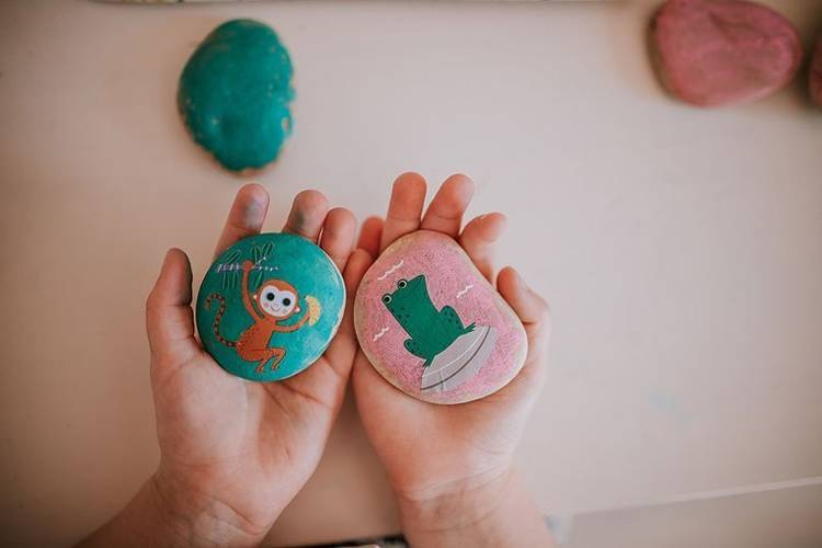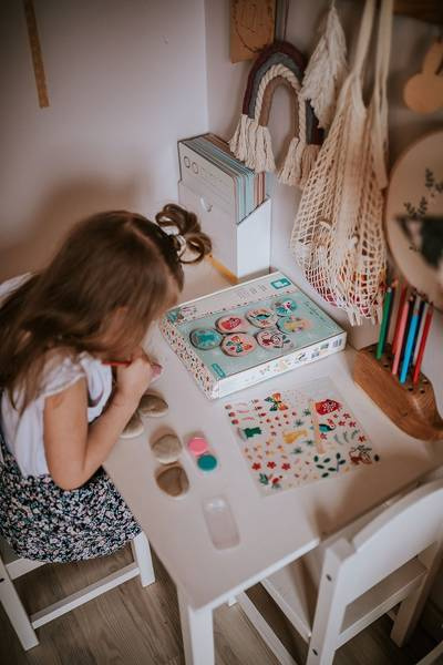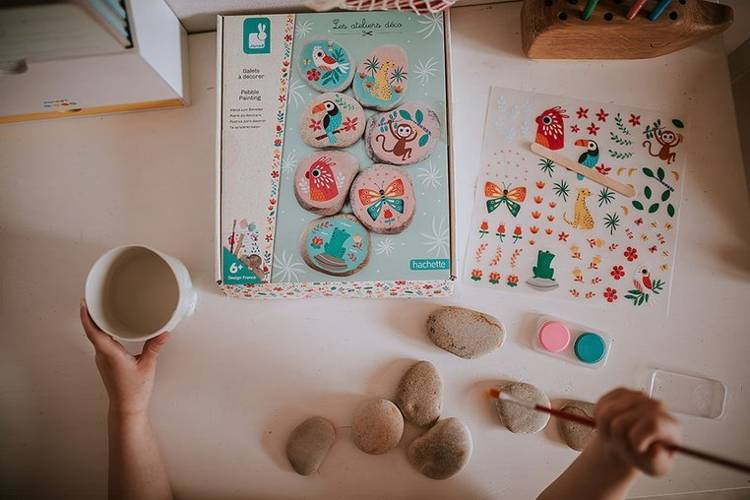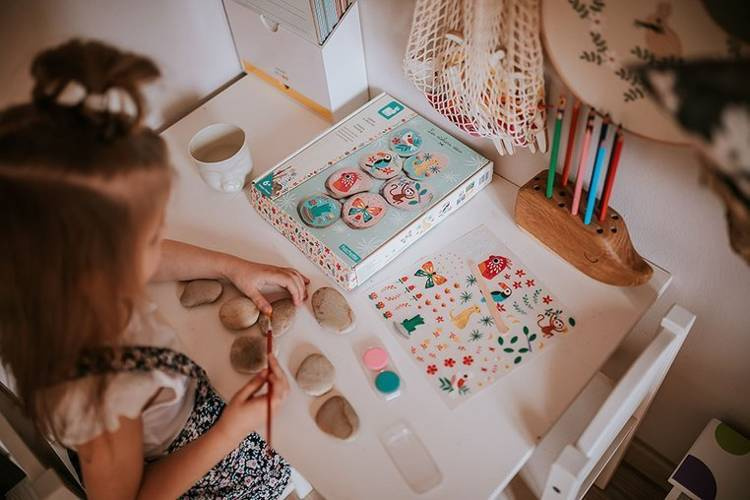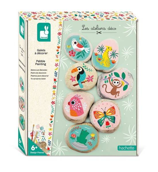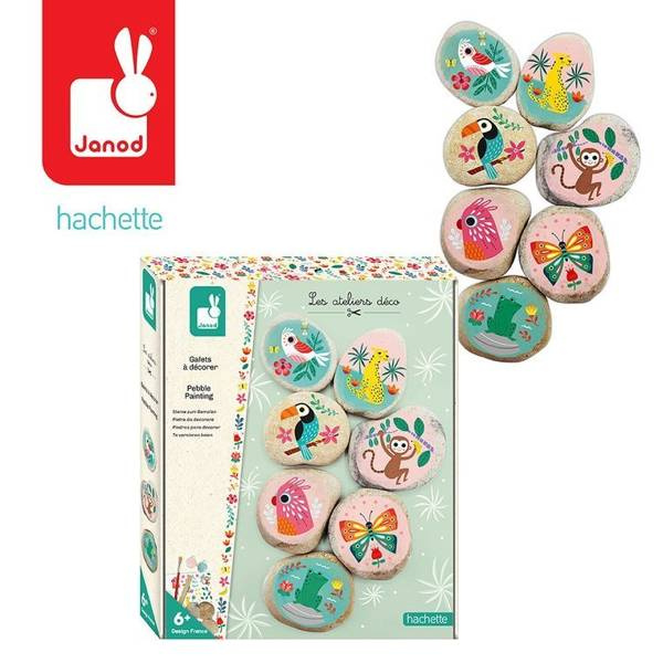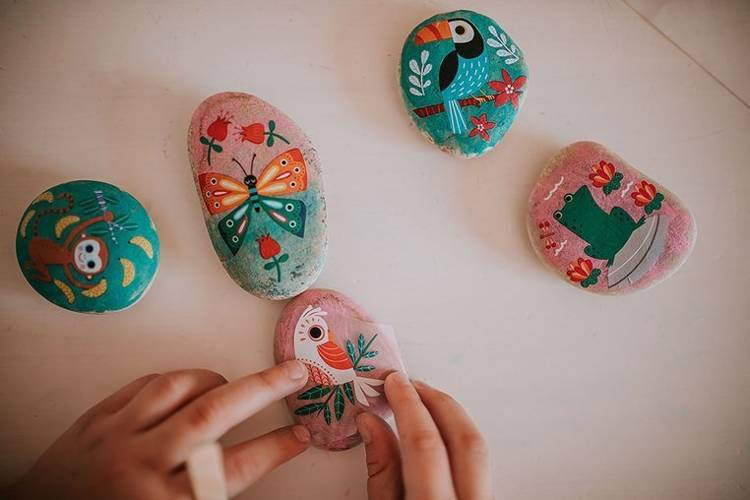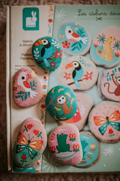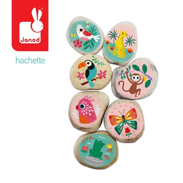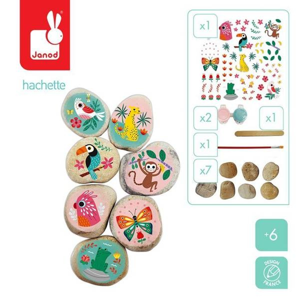 Zestaw kreatywny Kamienie do ozdabiania francuskiej marki JANOD zawiera 7 jasnych, płaskich kamieni, 1 arkusz z elementami do transferu, drewniany patyczek, ułatwiający przenoszenie wzorów oraz 2 farbki i pędzel, za pomocą których można stworzyć tło dla nanoszonych na kamyki ilustracji. Na arkuszu znajdują się różne większe i mniejsze motywy zwierzęce i kwiatowe. Wybrane spośród nich elementy należy wyciąć, umieścić na kamieniu, a następnie potrzeć je drewnianym patyczkiem zgodnie z załączoną instrukcją, aby przenieść wzór. Ozdabianie to dla dziecka długie godziny angażującej i jednocześnie uspokajającej zabawy. Gotowe dzieła mogą stać się powodem do dumy, wspaniałą ozdobą dziecięcego pokoju lub oryginalnym podarunkiem.