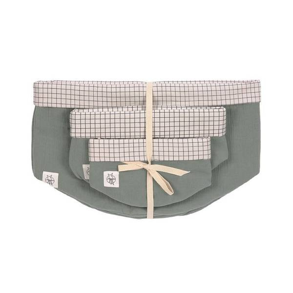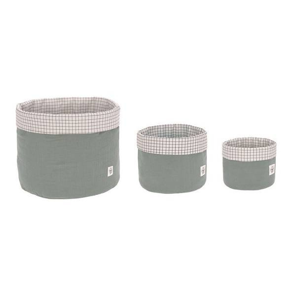 Zestaw trzech praktycznych, miękkich koszyków do przechowywania niemieckiej marki LASSIG wykonanych z muślinu (strona w kolorze zgaszonej zieleni) i perkalu (strona biała w delikatną czarną kratkę). Pomagają zachować porządek nie tylko w dziecięcych skarbach, akcesoriach i zabawkach, ale także np. w łazience, salonie czy kuchni. Zestaw składa się z trzech dwustronnych koszyków różnej wielkości, wzmocnionych od spodu i po bokach, dzięki czemu są stabilne, a przy tym – jeśli są puste – w razie konieczności można je złożyć na płasko lub włożyć jeden w drugi i przechowywać na małej przestrzeni. Koszyki są wytrzymałe i łatwe w pielęgnacji – można je prać w pralce w temperaturze 30°C w delikatnym cyklu.