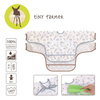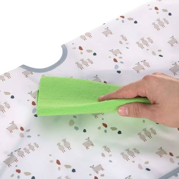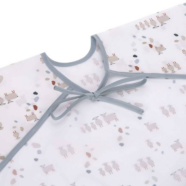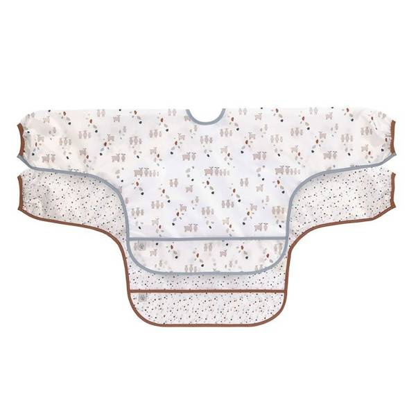 Zestaw dwóch praktycznych, łatwo zmywalnych śliniaków niemieckiej marki LASSIG. Są duże, wykonane z wodoodpornego tworzywa – jeden biały w multiprint w owieczki z obszyciem w kolorze zgaszonego niebieskiego, drugi w plamki typu lastriko z obszyciem w kolorze terakoty. Mają długie rękawy, miękką taśmę i wiązanie na tasiemki, a na dole funkcjonalną kieszonkę. Przeznaczone są dla dzieci od 6. do 24. miesiąca życia. Sprawdzą się nie tylko podczas karmienia malucha, ale też przy każdej twórczej aktywności dziecka: malowaniu, lepieniu z gliny, zabaw plasteliną czy prób samodzielnego przygotowania posiłku. Wygodne, nie krępują ruchów, dobrze przylegają do ubrań.