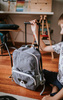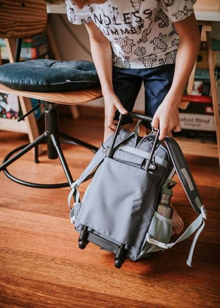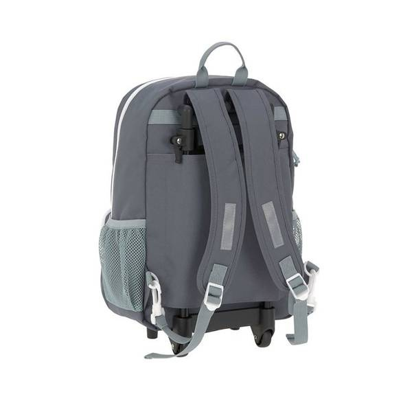 Walizka i plecak na kółkach 2w1 niemieckiej marki LASSIG to praktyczny, wielofunkcyjny gadżet, idealny zarówno do przedszkola czy szkoły, jak i na wycieczkę czy nawet wakacyjny wyjazd. Stelaż z kółkami posiada wysuwaną rączkę z regulacją wysokości, dzięki czemu można go łatwo dopasować nawet do wzrostu małego dziecka. Stelaż ten jest ponadto demontowany w kilku prostych krokach, co pozwala zamienić walizkę na typowy plecak do noszenia na plecach – ma on wygodne szerokie i miękkie ramiona z regulacją długości i odblaskami, a oprócz pojemnej kieszeni głównej, mieszczącej format A4 z wizytówką na podszewce, na której można zapisać imię dziecka i numer kontaktowy rodzica, także zapinaną na suwak zewnętrzną kieszonkę z przodu – z pyszczkiem szopa i śmiesznymi uszkami – oraz dwie boczne kieszenie z siatki. Plecak/walizka ma piękny ciemnoszary kolor, białe suwaki i szarobłękitne detale (podszewka, siatkowe kieszonki, uszko do zawieszania plecaka, np. na haczyku w szatni). Stelaż jest czarny. Materiał plecaka łatwo się czyści i jest odporny na wilgoć.