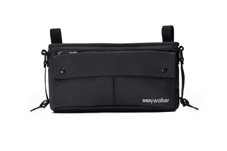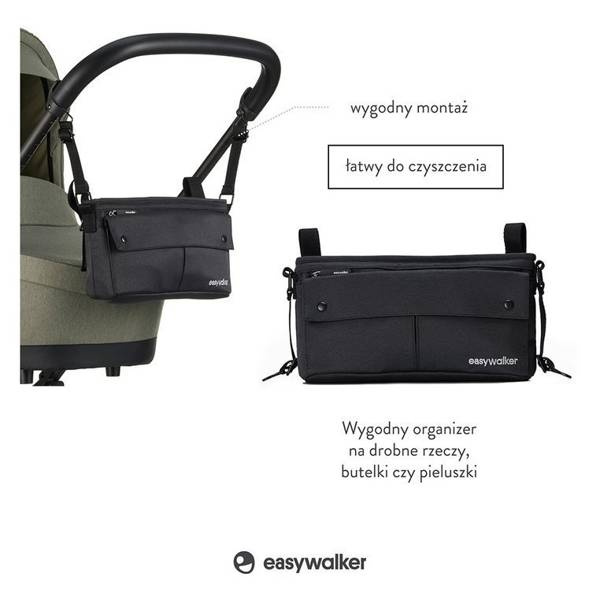 Poręczny organizer do wózka holenderskiej marki Easywalker. Ma niewielkie rozmiary, jest jednak bardzo pojemny i oprócz komory głównej posiada jeszcze dwie zewnętrzne kieszenie na suwaki (jedną z tyłu, jedną z przodu) oraz dwie mniejsze kieszenie frontowe, zapinane na wspólną klapkę na zatrzaski. Jest łatwy w montażu (posiada pasy do zamocowania na rączce wózka). Idealny na drobne rzeczy dziecka, m. in. butelkę, pieluchy czy ukochaną maskotkę, ale też drobiazgi, które rodzic chce mieć pod ręką w czasie spaceru, jak portfel czy klucze. Ma wzmocnione dno i brzegi, wykonany z solidnej tkaniny, wygodnej w czyszczeniu. Pasuje do wszystkich wózków i spacerówek marki, a także do większości spacerówek i wózków innych marek.