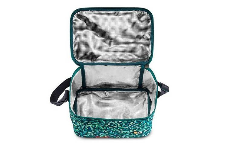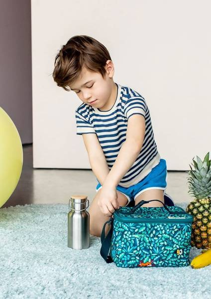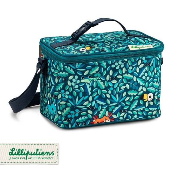 Urocza i poręczna torba termiczna na lunch z kolekcji Dżungla z linii produktów Przyjaciele w podróży belgijskiej marki Lilliputiens. Funkcjonalna, lekka i wygodna, idealna do przedszkola, szkoły na spacery czy wycieczki. Pomieści kanapki, napoje, owoce czy inne przekąski dziecka. Dno, ścianki i klapa torby pokryte są w całości powłoką termoizolacyjną, dzięki czemu posiłki wewnątrz dłużej zachowują świeżość, ponadto jest nieprzemakalna i łatwa w czyszczeniu. Suwak wzdłuż brzegu klapy z trzech stron sprawia, że torbę można wygodnie otworzyć i wypełnić smakołykami. Lunchówka ma ciekawy design – utrzymana jest w kolorach turkusowym, zielonym i granatowym, wyróżnia ją gęsty roślinny wzór i ukryte w nim postacie zwierzątek, charakterystycznych dla marki, m.in. tukana Pabla czy Lwa Jack'a. Posiada pasek na ramię z regulacją długości i rączkę, zapinaną na łatwy w obsłudze zatrzask. Uszyta została z wysokiej jakości materiałów. Jest perfekcyjnie wykończona, z dbałością o każdy szczegół i w pełni bezpieczna dla dziecka.
