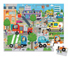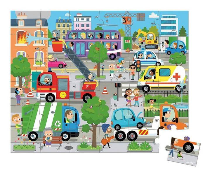 Zestaw puzzli w walizce Miasto francuskiej marki JANOD składa się z 36 poręcznych elementów, po ułożeniu tworzących piękny obrazek, przedstawiający ruchliwą ulicę w centrum miasta. Pełno tu interesujących pojazdów, m.in. dźwig, piętrowy autobus, wóz strażacki, którego ekipa właśnie gasi pożar w kamienicy, laweta, śmieciarka czy ambulans. Puzzle wykonane są z solidnego kartonu i zaprojektowane i wyprodukowane we Francji. Zapakowane w estetyczną walizeczkę z rączką. Idealnie nadają się na prezent.