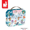 Zestaw puzzli w walizce Zabawa na śniegu francuskiej marki JANOD składa się z 36 poręcznych elementów, po ułożeniu tworzących piękny obrazek, przedstawiający urocze zwierzątka, bawiące się zimą na leśnej polanie, lepiące bałwana, rzucające śnieżkami czy kąpiące się w przeręblu. Są tu m.in. lisek, ryś, wiewiórka, narwal, mors, foka, zajączki oraz jelonki. Puzzle wykonane są z solidnego kartonu. Zaprojektowane i wyprodukowane we Francji. Zapakowane w estetyczną walizeczkę z rączką. Idealnie nadają się na prezent.