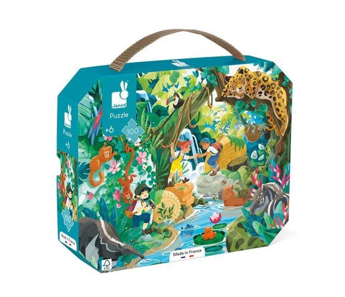 Zestaw puzzli w walizce Przygoda w kraju Inków francuskiej marki JANOD składa się ze 100 elementów, po ułożeniu tworzących piękny, bogaty w szczegóły obrazek, przedstawiający trójkę podróżników w tropikalnym lesie nad brzegiem Amazonki. Otacza ich fascynująca przyroda i wiele zwierząt, m.in. małpy, papuga, tukan, węże czy tapiry. Puzzle wykonane są z solidnego kartonu. Zaprojektowane i wyprodukowane we Francji. Zapakowane w estetyczną walizeczkę z rączką. Idealnie nadają się na prezent.