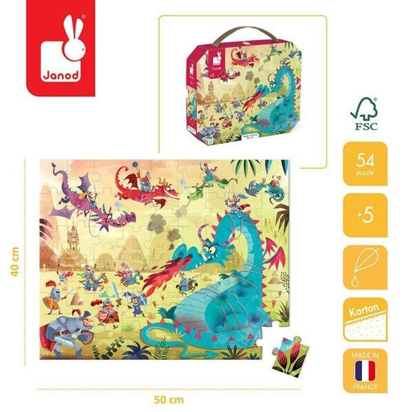 Zestaw puzzli w walizce Smoki francuskiej marki JANOD składa się z 54 elementów, po ułożeniu tworzących piękny, bogaty w szczegóły obrazek, przedstawiający walkę dwóch rycerskich drużyn – jednej pieszo i na koniach, a drugiej – latającej na smokach, w tym z jednym ogromnym i ziejącym ogniem. Akcja rozgrywa się na polanie w bajkowym lesie, nieopodal zamku. Puzzle wykonane są z solidnego kartonu. Zaprojektowane i wyprodukowane we Francji. Zapakowane w estetyczną walizeczkę z rączką. Idealnie nadają się na prezent.
