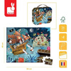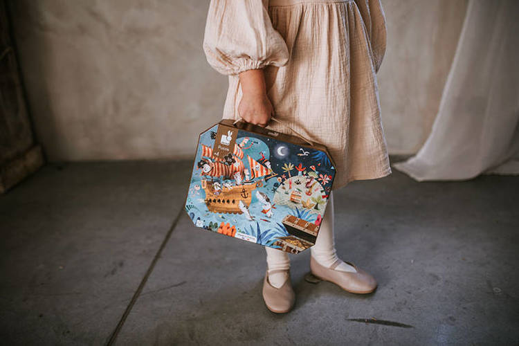 Zestaw puzzli w walizce Wyprawa po skarb francuskiej marki JANOD składa się z 36 poręcznych elementów, po ułożeniu tworzących interesujący obrazek, przedstawiający ukrytą w zaroślach skrzynię ze złotem, tropikalną wyspę i statek piracki, atakowany przez rekiny. Puzzle wykonane są z solidnego kartonu. Zaprojektowane i wyprodukowane we Francji. Zapakowane w estetyczną walizeczkę z rączką. Idealnie nadają się na prezent.