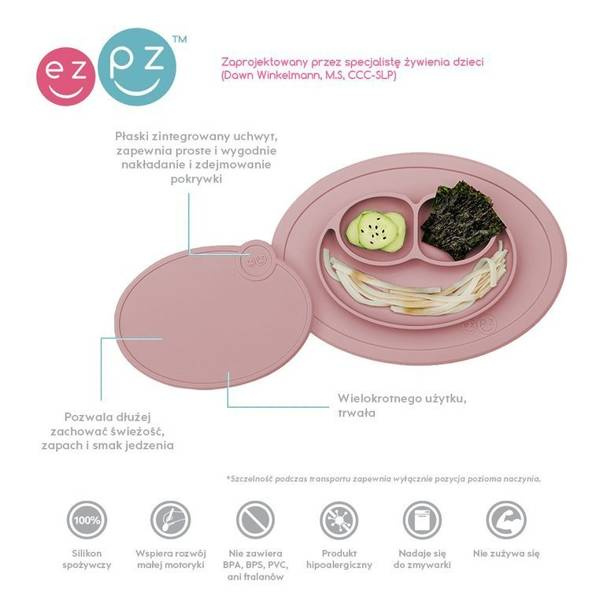 Silikonowa pokrywka amerykańskiej marki EZPZ (czyt. izipizi) ma owalny kształt i dedykowana jest do małego talerzyka Mini Mat jako praktyczne akcesorium, ułatwiające przechowywanie i przenoszenie w nim przekąsek, pokarmów oraz ich resztek. Pokrywka precyzyjnie przywiera do naczynia, co pozwala dłużej zachować świeżość, zapach i smak jedzenia, ale szczelność podczas przewożenia zapewnia wyłącznie pozycja pozioma naczynia. Posiada płaski zintegrowany uchwyt, dzięki któremu jej zdejmowanie i nakładanie jest bardzo proste i wygodne.