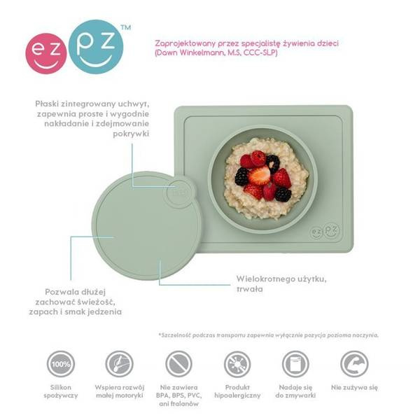 Silikonowa pokrywka amerykańskiej marki EZPZ (czyt. izipizi) ma okrągły kształt i dedykowana jest do miseczki Mini Bowl jako praktyczne akcesorium, ułatwiające przechowywanie i przenoszenie w nim przekąsek, pokarmów oraz ich resztek. Pokrywka precyzyjnie przywiera do naczynia, co pozwala dłużej zachować świeżość, zapach i smak jedzenia, ale szczelność podczas przewożenia zapewnia wyłącznie pozycja pozioma naczynia. Posiada płaski zintegrowany uchwyt, dzięki któremu jej zdejmowanie i nakładanie jest bardzo proste i wygodne.