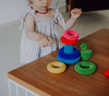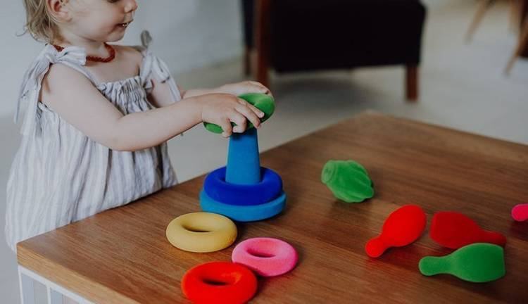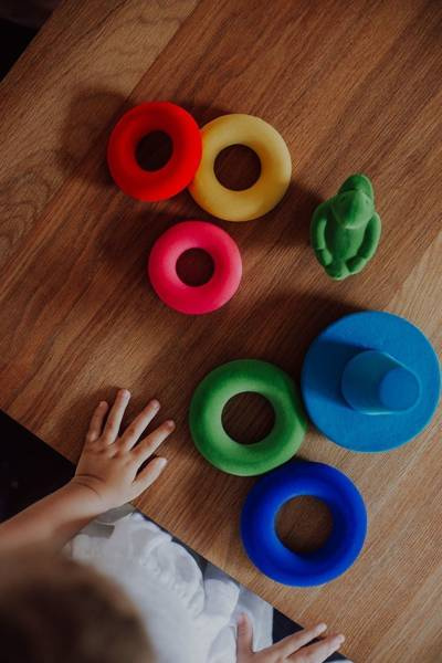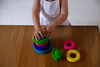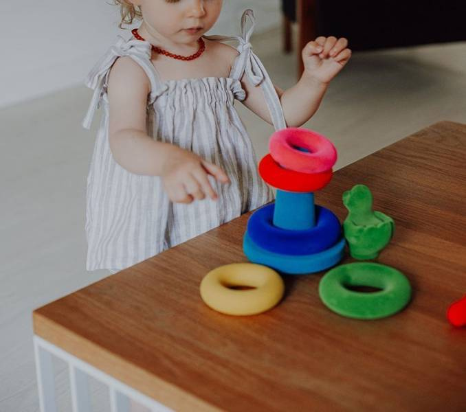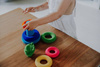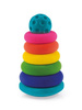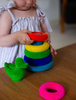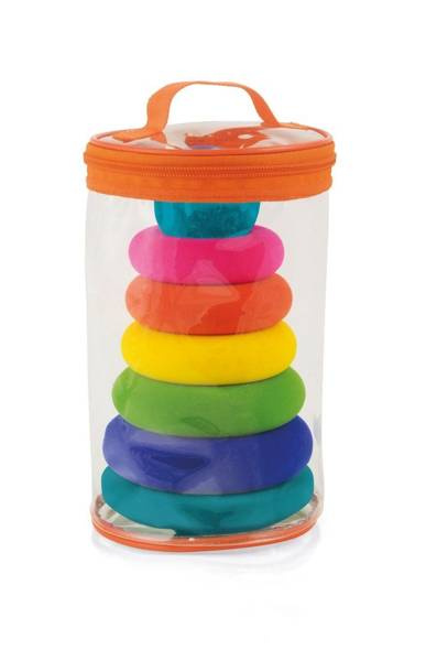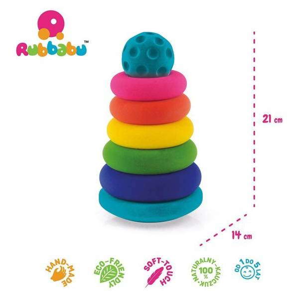 Układanka edukacyjno-sensoryczna piramida z piłką marki Rubbabu to doskonała, rozwojowa zabawka, rekomendowana dla dzieci od 1. roku życia. Składa się z piłki golfowej sensorycznej w kolorze turkusowym, 6 obręczy i pałąka-stożka, na którym należy je umieszczać w odpowiedniej kolejności – od największej do najmniejszej. Wyjątkowo miękkie i przyjemne w dotyku elementy mają jaskrawe kolory (różowy, pomarańczowy, żółty, zielony, ciemnoniebieski i turkusowy). Dzięki prostej formie i stymulującej teksturze aktywizują dziecięcą wyobraźnię i zachęcają do zabawy, a ponadto są lekkie i bezpieczne, także dla niemowląt. Wszystkie części można ściskać, ugniatać, rzucać... Dla nieco starszych dzieci układanie piramidy to z kolei lekcja skupienia uwagi i nauka koordynacji ręka-oko.