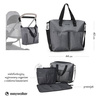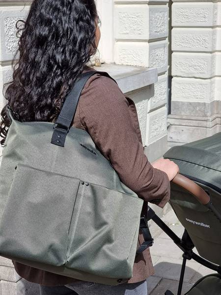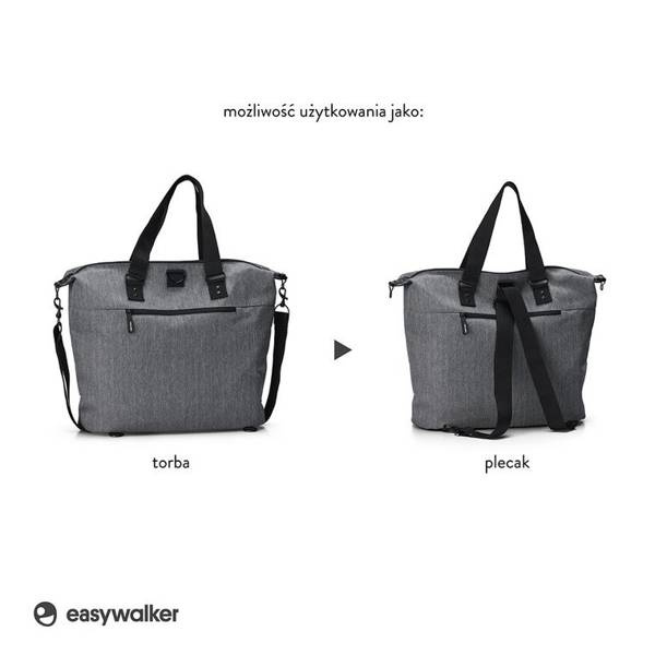 Poręczna i pojemna (max. ładowność 2,5 kg) torba do wózka holenderskiej marki Easywalker w stylu unisex. Idealna na wszystkie niezbędne rzeczy dziecka i rodzica. To klasyczny, elegancki dodatek dla mamy lub taty – dzięki uchwytom i detalom ze skóry ekologicznej prezentuje się bardzo stylowo. Można nosić ją w ręku, przewieszoną przez ramię lub jako plecak, posiada bowiem odczepiany ergonomiczny pasek, który można mocować w odpowiedniej pozycji. Pasek ten umożliwia również zawieszenie torby na ramie wózka. Komora główna jest zapinana na suwak, wewnątrz niej znajduje się kilka kieszonek, w tym dwie z gumowanymi brzegami, ułatwiającymi utrzymanie pionie butelek z mlekiem lub napojami. Z łatwością posegregujesz w niej pieluszki, chusteczki, ubranka i inne artykuły pierwszej potrzeby. W komplecie jest także poręczna, składana mata do przewijania oraz wyjmowany organizer (można go też używać osobno) – oba akcesoria w grafitowo-czarne ukośne paski z eleganckim czarnym obszyciem. Na zewnątrz w tylnej ściance torby znajduje się nieduża kieszonka na suwak, w której pomieścisz drobiazgi, np. klucze czy telefon. Dwie otwarte kieszenie z przodu będą doskonałym miejscem na pluszaka, śliniak czy inną rzecz, którą potrzebujesz mieć pod ręką. Torba wykonana jest z miękkiej, wodoodpornej, łatwej do czyszczenia i ekologicznej tkaniny. Matę oraz organizer można prać w pralce w łagodnym trybie, w 30°C. Kolorystycznie odpowiada kolekcji wózków Harvey³ Premium, jest jednak uniwersalna i pasuje do wszystkich wózków i spacerówek Easywalker oraz do większości spacerówek i wózków innych marek.