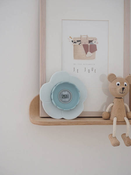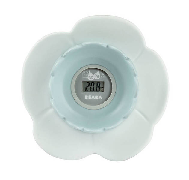 Termometr Lotus francuskiej marki BEABA przeznaczony jest do mierzenia temperatury wody do kąpieli maluszków oraz temperatury otoczenia, np. w pokoju. Jest precyzyjny (do jednego miejsca po przecinku), szybki (podaje wynik w 5 sekund) i wyjątkowo wygodny w użyciu – unosi się na powierzchni, ma czytelny wyświetlacz i ciekawy kształt kwiatu (lotosu) z zewnętrzną, elastyczną, miękką nakładkę w postaci płatków, która sprawia, że jest całkowicie bezpieczny dla dziecka – nie ma ryzyka skaleczenia, nawet podczas brania go do ust. Kwiat może być także zabawką-gryzakiem, umilającym maluchowi czas kąpieli. Wyświetlacz działa automatycznie bez konieczności włączania i wyłączania urządzenia. Termometr jest łatwy w czyszczeniu: wystarczy przemyć wodą z mydłem.
