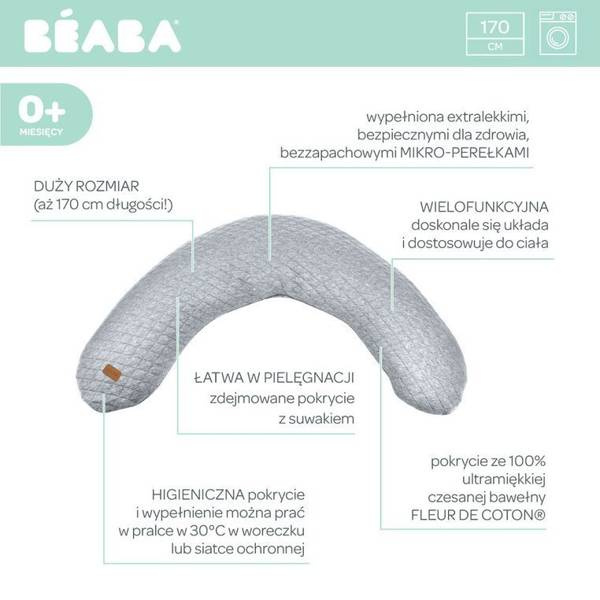 Ergonomiczna poduszka rogal Big Flopsy™ to idealne, komfortowe rozwiązanie na okres ciąży i karmienia, francuskiej marki BEABA. Poduszka gwarantuje wygodę i wsparcie przyszłej mamie oraz zapewnia odpowiednią pozycję i bezpieczeństwo zarówno jej, jak i maluszkowi w trakcie karmienia czy innych chwil bliskości. To prawdziwy ewenement na rynku! Ma aż 170 cm długości, a dzięki innowacyjnemu wypełnieniu z mikro-perełek doskonale się układa i dostosowuje do ciała, zapewniając komfort w każdej pozycji, np. spaniu na boku czy z lekko uniesionymi nogami, a także podczas karmienia piersią lub butelką. Może pełnić też funkcję miękkiego, delikatnego i uspokajającego kokonu, zapewniając optymalny komfort mamie i dziecku w chwilach wypoczynku i bliskości.
