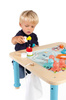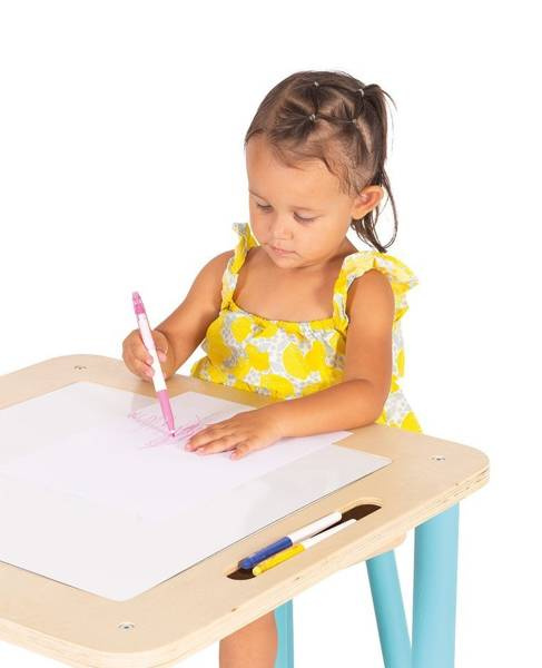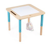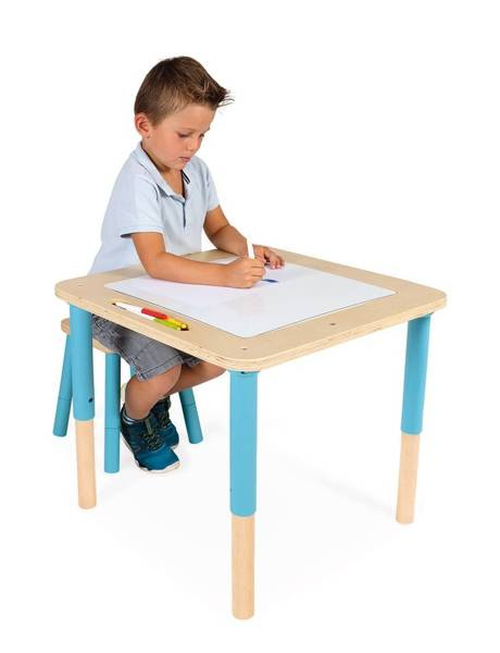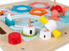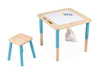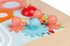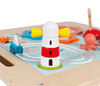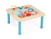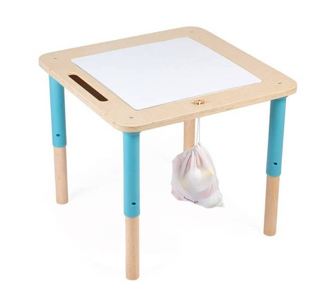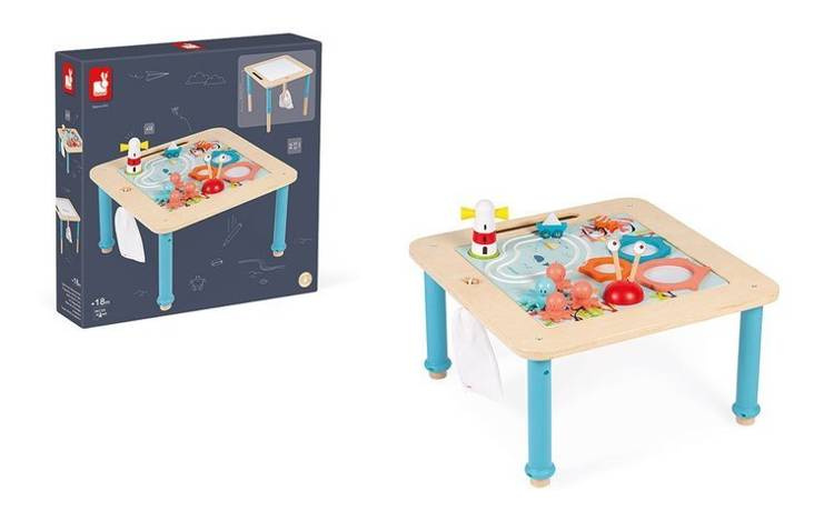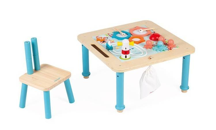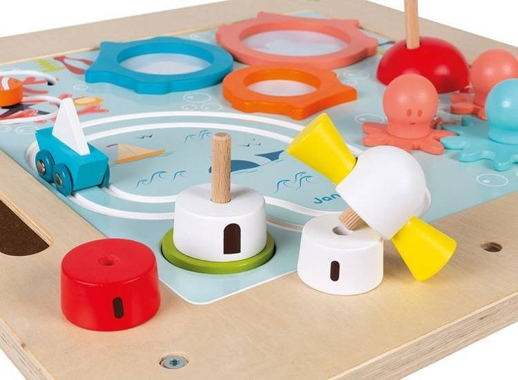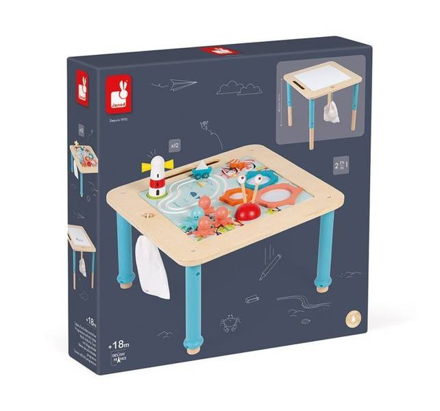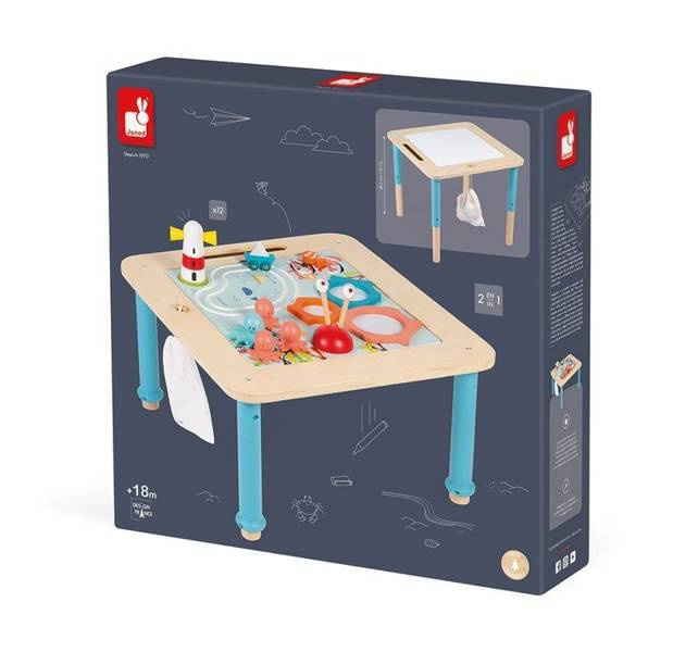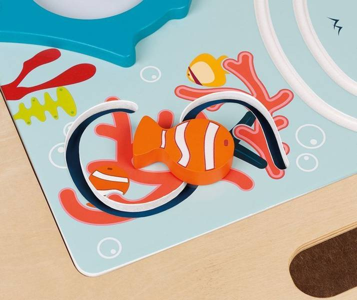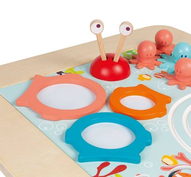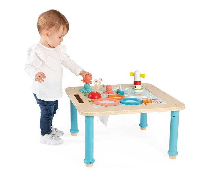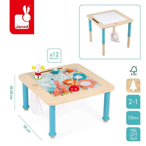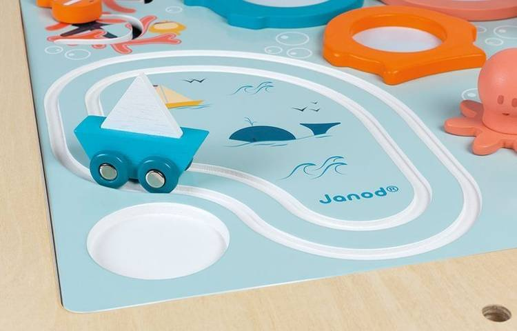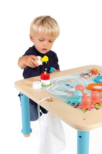 Drewniany progresywny stolik aktywizujący francuskiej marki JANOD to idealna zabawka dla dzieci od 18. miesiąca życia. Kwadratowy mebelek z bezpiecznymi zaokrąglonymi brzegami osadzony jest na czterech szeroko rozstawionych, stabilnych nóżkach. Zachwyca estetyką i pomysłowością, pięknymi kolorami i uroczymi elementami, tworzącymi ocean – z torem dla drewnianej łódeczki i drugim – dla rybki (do przesuwania), 4 ośmiorniczkami – kółkami zębatymi, sporym drewnianym ślimakiem, 3 obręczami – rybkami w różnych wielkościach oraz zieloną wyspą z piramidką – 4-elementową latarnią morską. Blat można obrócić – po drugiej stronie jest gładki i może pełnić rolę zwykłego dziecięcego stolika do rysowania czy innych aktywności. Ponadto nóżki stolika można wydłużyć aż o 20 cm (ma odpowiednio 30 lub 50 cm wysokości), zatem mebelek rośnie razem z dzieckiem i da się go dostosować do zmieniających się potrzeb. Do zestawu dołączony jest też spory woreczek na akcesoria. Zabawka rozwija koordynację ruchową i małą motorykę, trenuje spostrzegawczość i logiczne myślenie, uczy zauważać zależności przyczynowo-skutkowe. Wiele różnorodnych funkcji sprawia, że się nie nudzi, a kolory (m. in. jasnego drewna, błękitu, różu i bieli) – zachwycają.