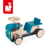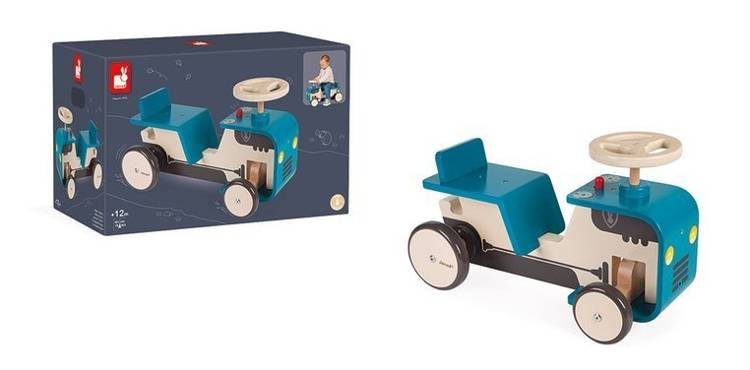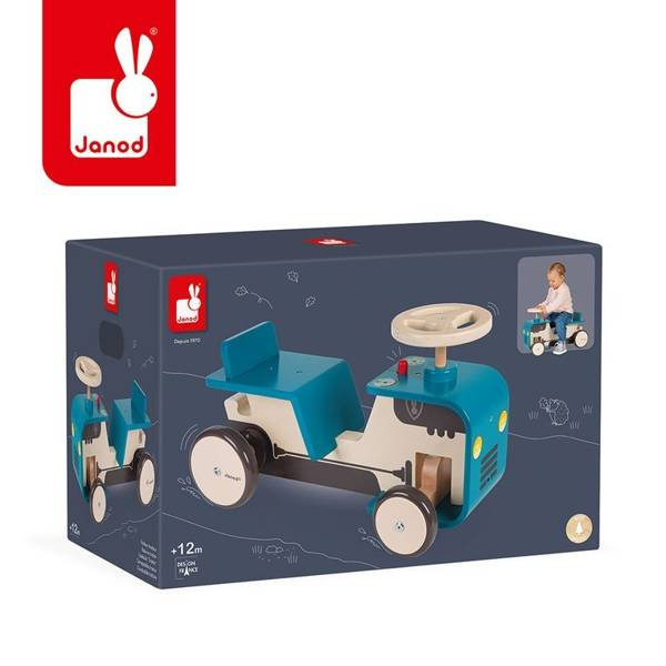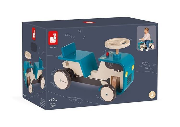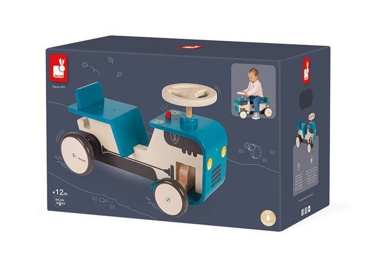 Drewniany jeździk Traktor francuskiej marki JANOD to idealna zabawka dla aktywnych dzieci od 1. roku życia, do domu i na podwórko. Wspiera w rozwoju ruchowym. Starannie wykonany, z najlepszej jakości materiałów i ogromną dbałością o estetykę. Ma ergonomiczną zaokrągloną budowę (gięte drewno), nadającą mu stylowy charakter, siedzisko z niskim oparciem dla większej wygody, umieszczone na optymalnej wysokości (21 cm), co ułatwia dziecku samodzielne wsiadanie i zsiadanie. Lekka konstrukcja sprawia, że pojazd jest łatwy w prowadzeniu i utrzymywaniu w równowadze. Duże koła są stabilne i szeroko rozstawione, wykończone gumą, dzięki czemu nie rysują podłogi w domu. Jeździk posiada ergonomiczną drewnianą, obracaną kierownicę i przycisk, imitujący dźwięk klaksonu. Pojazd jest niebieski z namalowanym silnikiem, charakterystycznym dla traktora, światłami, licznikiem i wskaźnikiem baku oraz otworami wentylacyjnymi na masce. Nauczy dziecko utrzymywania równowagi i koordynacji, będzie doskonałym wprowadzeniem do nauki jazdy na rowerku biegowym.