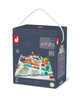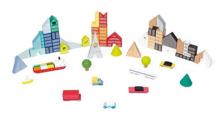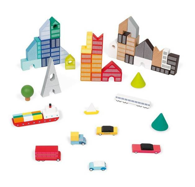Zestaw kolorowych, drewnianych klocków i puzzli Miasto z kolekcji Kubix francuskiej marki JANOD zawiera 60 poręcznych brył – m.in. budynków, drzew i pojazdów (w tym: autobus, metro, prom towarowy, ciężarówka, taksówka, żaglówka, samochód osobowy i in.) – oraz 20 kartonowych puzzli, po ułożeniu tworzących miejską przestrzeń z ulicami, parkingami, parcelami pod budowę domów lub biurowców, parkami, torami i rzeką, które można wykorzystywać np. jako planszę do zabawy. Klocki są pięknie pomalowane, w przyjaznych dla dziecka, a jednocześnie typowych dla miejskiego krajobrazu kolorach – naturalnego drewna, bieli, czerni, szarości, zieleni czy czerwieni.
