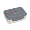 Solidne pudełko śniadaniowe ze stali nierdzewnej niemieckiej marki LASSIG przyda się nie tylko do szkoły, ale również podczas rodzinnych spacerów i wycieczek. Jest pojemne i posiada ruchomą, wyjmowaną przegrodę, dzięki której można je podzielić na dwie części, np. większą na kanapki, a mniejszą na owoce, krojone warzywa czy inne przekąski. Pudełko jest szczelne (ma silikonową uszczelkę wokół pokrywki) i solidne. Szeroki klips, na który jest zamykana pokrywka, uniemożliwia jego samoczynne otwarcie. Lunchbox ma ergonomiczny kształt. Zmieści się nawet do małego plecaka. Ma srebrny kolor, pokrywka i przegroda są w kolorze szaroniebieskim, a na górze znajduje się grafika rudo-brązowego tygrysa w szaroniebieskie pasy.
