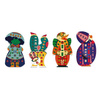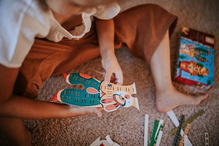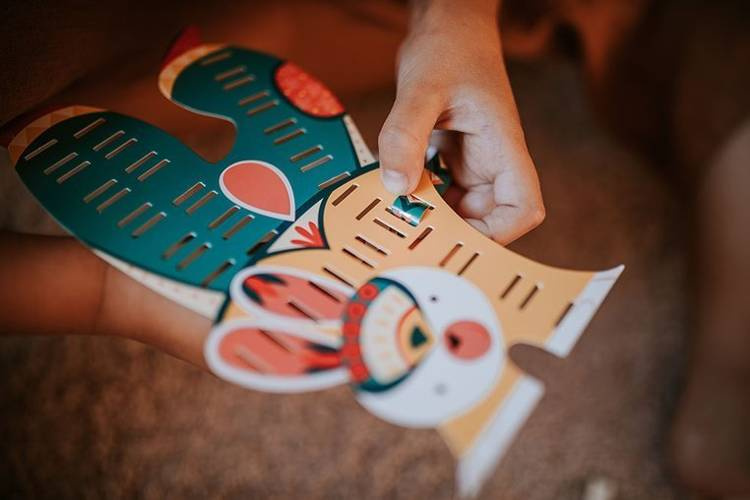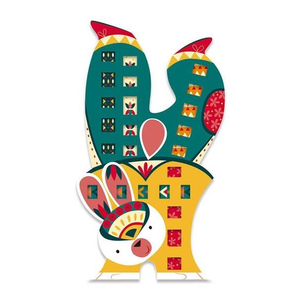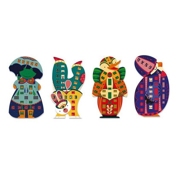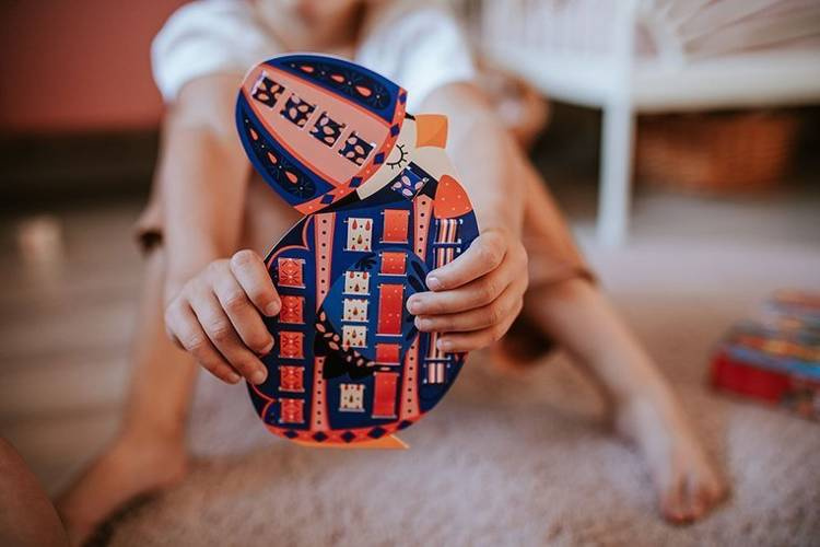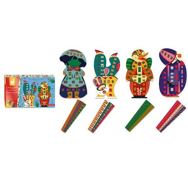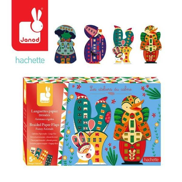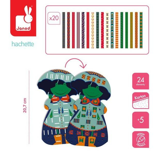 Zestaw kreatywny Papierowa przeplatanka Zabawne zwierzaki francuskiej marki JANOD zawiera 4 kolorowe plansze-postacie: pingwina, kaczora, żabę i królika, które można ozdabiać dołączonymi paskami wzorzystego papieru. W komplecie znajduje się 20 różnobarwnych papierowych pasków w niebanalne wzorki – po 5 do każdej planszy, w planszach zaś – nacięcia, przez które można owe paski przeplatać tak, by tworzyły urokliwe „okienka” na ubrankach czy częściach ciała zwierząt. Paski można dopasować do kolorystyki czy stylu konkretnego zwierzątka lub wybrać je na zasadzie kontrastu, wedle własnego uznania i fantazji. Przeplatanie i robienie ozdób z papieru to dla dziecka angażująca i jednocześnie uspokajająca zabawa. Gotowe dzieła mogą stać się powodem do dumy i wspaniałymi dekoracjami dziecięcego pokoju.