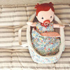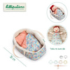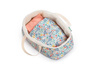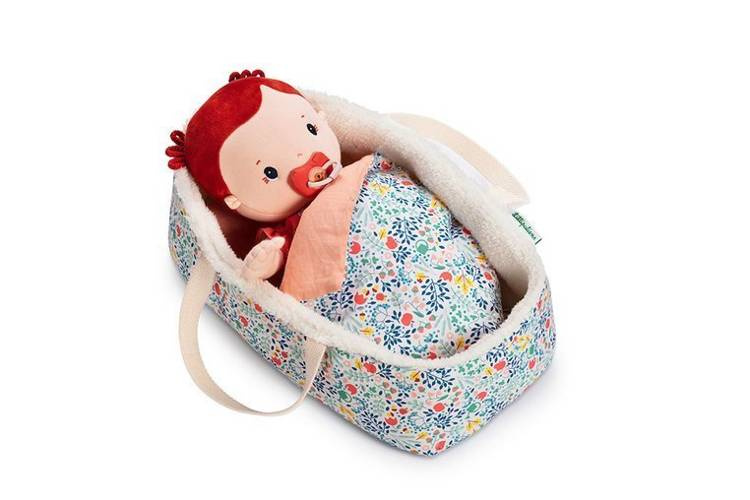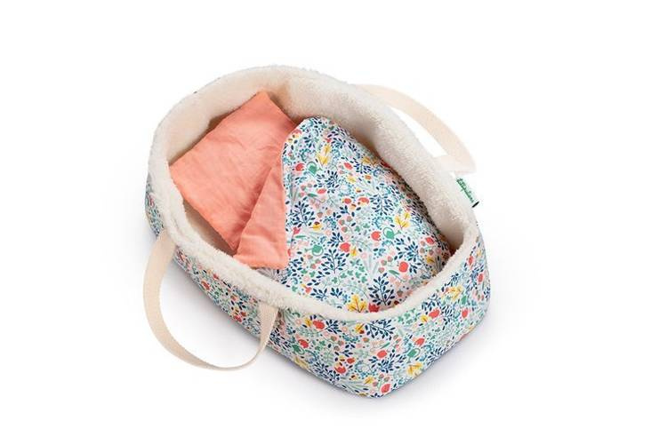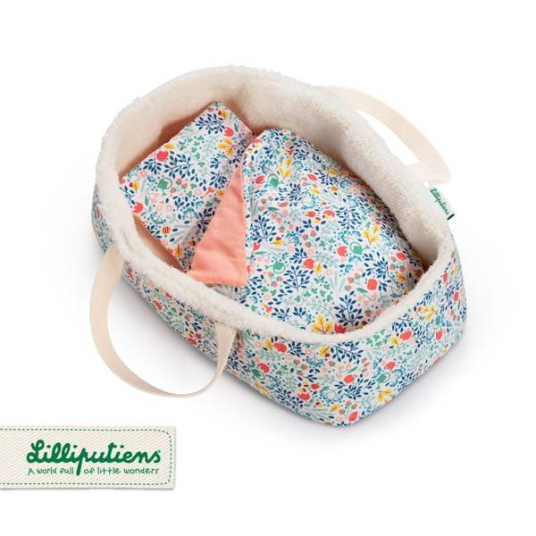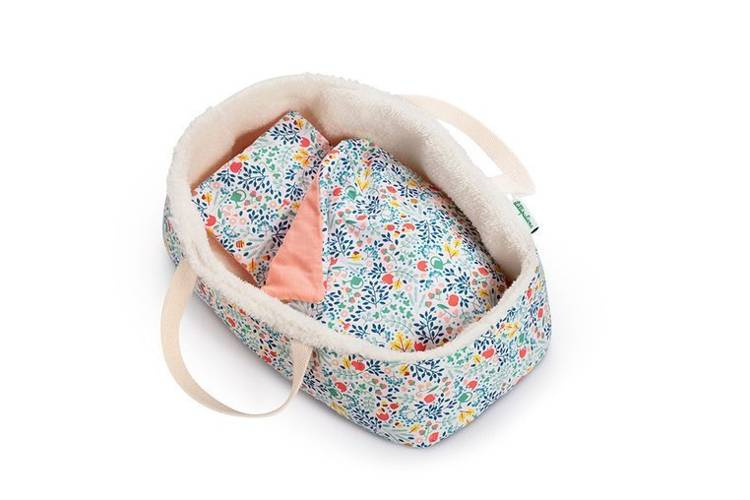 Koszyczek-nosidełko dla lalki belgijskiej marki Lilliputiens to idealny dodatek do zabawy lalkami, usypiania ich, uspokajania, układania do snu, zabierania na spacer czy po prostu zabawy w dom. Nadaje się dla lalek o maksymalnej wysokości 36 cm lub mniejszych. Jest stabilny, wewnątrz wypełniony futerkiem, a na zewnątrz – w urokliwy drobny kwiatowy wzór, który powtarza się na dołączonych do zestawu poduszeczce i kocyku. Te ostatnie elementy są dwustronne, a po drugiej stronie – gładkie w łososiowym odcieniu różu. Koszyczek ma wygodne rączki do przenoszenia. Jest perfekcyjnie wykończony, z dbałością o każdy szczegół i w pełni bezpieczny dla dziecka. Zabawka stymuluje rozwój motoryczny i społeczny dziecka, powala mu odgrywać znajome role i oswajać codzienność, pomaga także w nauce empatii.
