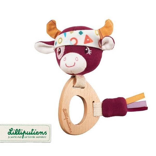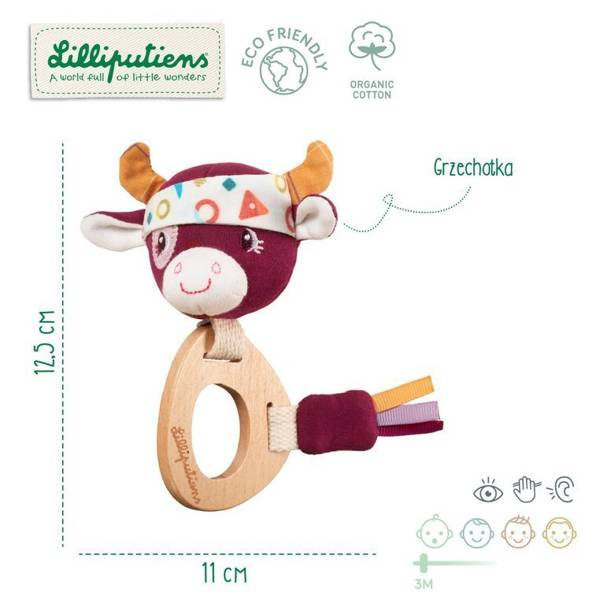 Grzechotka z drewnianym gryzakiem Krówka Rosalie belgijskiej marki Lilliputiens to niebanalna aktywizująca zabawka dla niemowląt. Na drewnianym poręcznym uchwycie przymocowana jest grzechotka – główka bordowej Krówki Rosalie (z uszkami, rogami i przepaską na czole) oraz jej stymulujący sensorycznie ogon z różnego rodzaju tkanin (z bawełny organicznej). Uchwyt ma bezpieczny obły kształt i z powodzeniem może pełnić rolę gryzaka. Potrząsany wydaje przyjemne dla ucha dźwięki. Tkaninowe elementy można zdejmować do prania. Zabawka rozwija małą motorykę (chwytanie, potrząsanie), aktywizuje zmysł słuchu (grzechocze), wzroku i dotyku (różne materiały i wypustki), pozwala dostrzegać związki przyczynowo-skutkowe i przynosi ulgę w trudnym okresie ząbkowania.