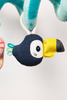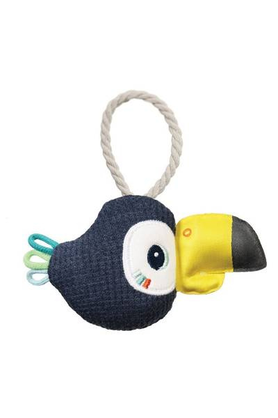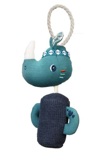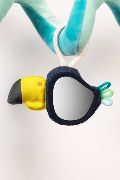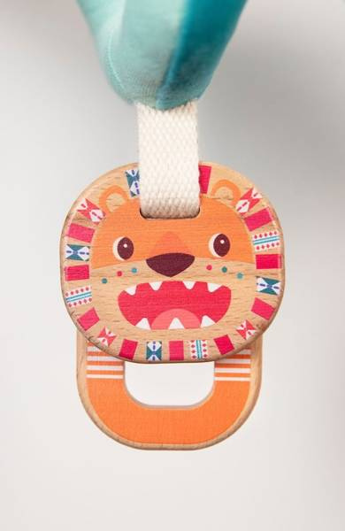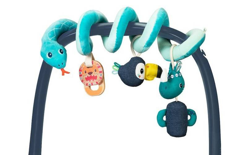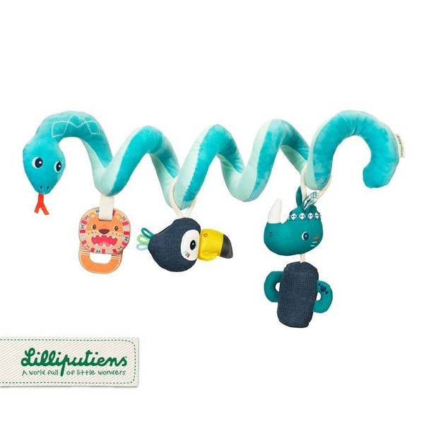 Wielofunkcyjna spirala do wózka z kolekcji Dżungla belgijskiej marki Lilliputiens to idealna zabawka dla niemowląt. Ma postać niebieskiego Węża Bertranda w formie długiej spirali, którą można owinąć wokół pałąka wózka, nosidełka, fotelika samochodowego czy barierki łóżeczka. Znajdują się na niej kolejno: dwuczęściowy drewniany Lew Jack z uchwytem, którego elementami można stukać, Tukan Pablo z bezpiecznym, giętkim lusterkiem oraz Nosorożec Marius ze sznurkową szyją i tułowiem w kształcie walca, wewnątrz którego znajduje się dzwoneczek. Wąż ma dodatkowo stymulujący sensorycznie rozdwojony język. Zabawka jest solidnie wykonana i w pełni bezpieczna dla maluszków. Rozwija małą motorykę (chwytanie, potrząsanie, obracanie, pociąganie, bujanie), aktywizuje zmysł słuchu (dzwoni, stuka), wzroku (lusterko) i dotyku.